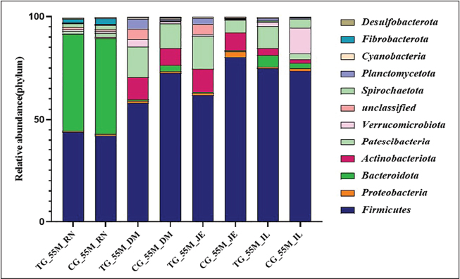 Fig. 5. Changes in the relative abundance of the 55-day-old microbiota in the treatment and control groups at the phylum level Stacked bar charts show the relative abundance profile of the bacterial communities at the phylum level in 55-day-old Hu lambs across different gut sites, comparing probiotic-treated groups (TG55) with their corresponding control groups (CG55). Only the dominant bacterial phyla with an average relative abundance of >1% are shown. The color legend identifies each phylum, allowing for a visual comparison of how the treatment influenced the overall microbial community structure in young lambs.