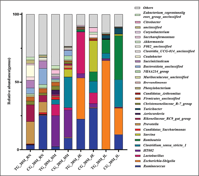 Fig. 6. Changes in the relative abundance of 20-day-old microbiota in the treatment and control groups at the genus level Stacked bar charts display the relative abundance of gut microbiota at the genus level in 20-day-old lambs across groups. Genera with low average abundance are grouped as "Others." The figure highlights the distribution of key functional genera or genera showing significant differences in abundance between the treatment and control groups.
