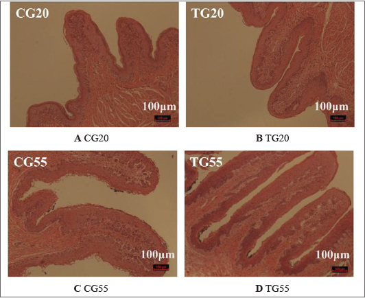 In the control group, the villus height in the duodenum at both 20 and 55 days of age was significantly lower than that at birth. The crypt depth and muscularis propria thickness were significantly greater at 55 days compared with those at 20 days and at birth. The V/C ratio in control lambs at both 20 and 55 days of gestation was significantly lower than that at birth. In the jejunum, the villus height at 55 days was significantly higher than that at 20 days and at birth. The crypt depth and muscularis propria thickness at 55 days were also significantly greater than those at 20 days and at birth. The V/C ratio at birth and 55 days was significantly higher than that at 20 days. In the ileum, the villus height and crypt depth at 55 days were significantly greater than those at 20 days and birth, while the muscularis propria thickness was also significantly higher at 55 days compared to earlier stages. However, no significant differences in V/C were observed among the three control groups.