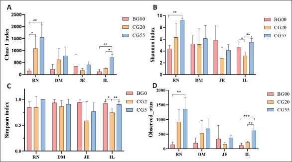 Fig. S3. Dynamic changes in α diversity metrics of the gut microbiota of Hu lambs at 0, 20 and 55 days of age. (A) Chao1 index; (B) Shannon index; (C) Simpson index; (D) Observed_otus. All values are reported as mean ± SD, in which * indicates statistical significance (p < 0.05).