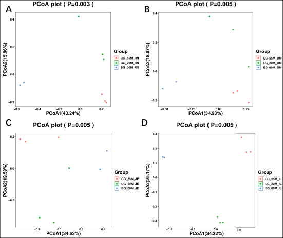 Fig. S4. PCoA of the gut microbiota of Hu lambs at 0, 20 and 55 days of age. (A) Rumen. (B) Duodenum. (C) Jejunum. (D) Ileum.