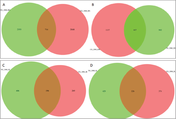 Fig. S5. Venn diagrams of the composition of ASVs in gut microbiota of Hu lambs in the 20-day-old treatment and control groups. (A) Rumen. (B) Duodenum. (C) Jejunum. (D) Ileum.