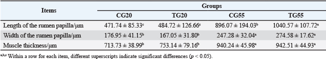 Morphological analysis revealed significant differences in gastrointestinal tissue structure across different stages in the control group of Hu lambs from birth to 55 days of age. Notably, the length and width of the rumen papillae, as well as the rumen muscle layer, were significantly greater at 55 days of age than at 20 days of age. The increase in rumen papillae dimensions is believed to enhance the absorption efficiency of volatile fatty acids (VFAs), thereby improving feed conversion rates and promoting growth and development (Na and Guan, 2022). These findings reveal significant improvements in rumen fermentation performance as Hu lambs mature.