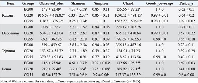 Table 3. Changes in α-diversity of gut microbiota of Hu lambs at 0, 20, and 55 days of age.