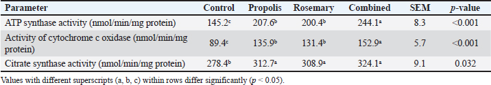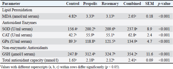 Oxidative stress markersSerum MDA levels were significantly lower in all groups than in the control group (p < 0.001). MDA (primary indicator of lipid peroxidation of cellular membranes) levels were significantly decreased by 31%, 35%, and 45% in the propolis, rosemary, and combined treatment groups, respectively (p < 0.001). The antioxidant enzyme activities were significantly improved in all treatment groups. The activity of superoxide dismutase, the first antioxidant enzyme barrier against reactive oxygen species, was enhanced by 28%, 34%, and 52% for propolis, rosemary, and combined treatments, respectively (Table 3). Table 3. Effects of propolis and rosemary extract supplementation on oxidative stress markers in late pregnancy Awassi sheep.