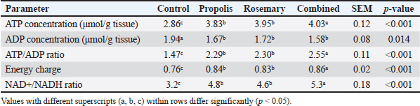 Cellular ATP levels and energy statusHepatic ATP levels increased in all treatment groups by 34%, 38%, and 41% for propolis, rosemary, and the combination treatment, respectively (p < 0.001). Hepatic ATP levels were significantly higher in all groups than in the control group (p < 0.001) (Table 2). Table 2. Effects of propolis and rosemary extract supplementation on hepatic adenosine triphosphate levels and energy status markers in Awassi sheep during late pregnancy.