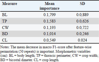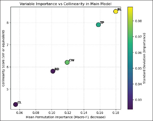 However, these models presented circularity because the predictors were partially derived from the same indices that define the target variable. Therefore, despite a slightly lower numerical performance, Model A (12 raw measurements) was considered the reference model due to its biological validity and independence from circular features. This trade-off highlights that morphometric information alone can capture functional aptitude patterns consistent with traditional zoometric evaluation when processed through supervised machine learning. The model was trained exclusively on the training portion and tuned via cross-validation, while the hold-out set was reserved for a single, unbiased performance assessment. This approach is widely adopted in machine learning research to prevent overfitting and simulate the behavior of the model on unseen data (Sun et al., 2025; Zhang et al., 2025). The stratified hold-out is particularly recommended in classification tasks with imbalanced classes because it reduces the risk of misleading performance metrics due to unequal class representation (Almuzadid and Subhiyakto, 2025; Chen et al., 2025). Training with raw measurements, rather than with defining indices, made the task more demanding, reducing circularity but lowering cross-validation performance. Nonetheless, the performance on the unseen set remained high. Given the limited sample size in the hold-out set, statistical confidence intervals for these metrics are relatively wide; therefore, performance differences between cross-validation and hold-out evaluation should be interpreted with caution until validated on larger, independent datasets. Variable importance and collinearityPermutation-based importance analysis on the hold-out set revealed that a limited subset of thoracic and pelvic measurements accounted for most of the model’s predictive performance in terms of macro-F1 (Table 5). BL was identified as the most influential trait (mean importance=0.1799, SD=0.0889), followed by thoracic perimeter (TP; 0.1583 ± 0.0626). Chest width, BD, and CL showed lower contributions but still provided measurable gains in predictive accuracy. The relatively high variability observed in BL importance is consistent with sensitivity to data partitioning, a behavior previously reported in morphometric trait-based classification models (Immaculate et al., 2020). Collinearity assessment using correlation matrices and variance inflation factors confirmed the presence of well-defined clusters of highly correlated traits, particularly among thoracic and pelvic measurements. This structural redundancy supports the use of ablation tests to evaluate whether a reduced set of variables can be used to preserve predictive performance, thereby improving model parsimony. Similar approaches have shown that removing redundant morphometric traits can enhance model generalizability without substantial loss of accuracy (Gizaw et al., 2007; Yakubu et al., 2011). Figure 2 integrates permutation-based feature importance and collinearity metrics, allowing simultaneous visualization of each trait’s predictive contribution and redundancy. Traits located in the upper-right quadrant, such as BL and TP, combine high predictive relevance with high collinearity, illustrating the trade-off between retaining informative variables and minimizing redundancy. This pattern supports targeted variable selection strategies, particularly for field-based applications where reducing the number of measurements can lower operational costs while maintaining predictive performance.