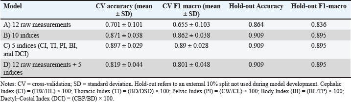 All misclassifications involved meat samples being labeled as dairy (37.5% of meat cases), indicating a tendency to favor dairy predictions. This pattern is consistent with the macro-precision (0.912) exceeding the macro-recall (0.812), reflecting a bias toward correct positive predictions at the expense of meat sensitivity. The absence of false positives for Meat underscores the specificity of the model for this class, albeit with reduced sensitivity. The superior performance on the hold-out set relative to cross-validation may be attributable to sampling variability, given the small evaluation size, as well as potential alignment between the hold-out distribution and patterns learned during training. Notably, the use of raw measurements—rather than derived indices—likely reduced information redundancy and circularity, making the classification task more challenging during cross-validation while still yielding robust generalization on unseen data. In addition to the main model based on raw morphometric data, auxiliary models trained with derived zoometric indices achieved higher accuracies of up to 90.9%, as shown in Table 6. Table 6. Ablation study comparing feature sets (Random Forest; 5-fold stratified cross-validation and 10% stratified hold-out).