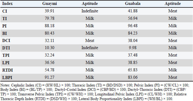 The CI, TI, PI, and BI indices reflect the general anatomical proportions of the animals and are essential for differentiating biotypes within a bovine population (Martínez et al., 2012). In this study, CI was significantly different between the genetic groups (p < 0.0001) and between the sexes within each group (p < 0.0001), suggesting that the shape and proportions of the head vary between Guaymi and Guabala, as well as between males and females within each breed. CI is a key marker for differentiating Creole breeds in Latin America, where variations related to ecological adaptation and selection pressure have been found (Ginja et al., 2013; Holgado et al., 2015). One of the most significant differences (p < 0.0001) was observed for TI, indicating that the depth and width of the thorax vary considerably between genotypes. This finding is consistent with that reported by Aguirre-Riofrio et al. (2019) in Creole cattle from Ecuador, where thoracic capacity was associated with adaptation to extensive grazing conditions and variable forage availability. However, PI was significantly different between the genetic groups (p < 0.0001) and between the sexes (p < 0.0001). This result differs from those of previous studies that have indicated that the variability in pelvic morphology in Creole breeds is usually less pronounced due to the natural selection stability in these populations. However, such variability was observed in this case (Contreras et al., 2011). Finally, BI was significantly different between the genetic groups (p < 0.001) but not between the sexes within each group (p=0.4846), indicating that the relationship between body length and thoracic perimeter is a determining feature in the differentiation of these breeds but not between the sexes. This index has been used to evaluate the productive aptitude and conformation of the breed biotype in Creole cattle of the Iberian Peninsula (Pastor et al., 2000). Productive indices, including DCI and the DTI, TPI, LPI, relative depth of the thorax RTDI, and LBPI indices, provide key information on the functional performance of cattle in terms of meat and dairy production. In this study, DCI and DTI showed statistically significant differences (p < 0.0001 and p < 0.001, respectively) between groups and between sexes (p < 0.0001 and p < 0.0001, respectively), suggesting that the proportions of the extremities in relation to the rib cage can be useful for selecting animals with better aptitudes for traction and resistance under extensive conditions (Cerqueira et al., 2013). Highly significant differences (p < 0.0001) were seen for TPI, which supports the hypothesis that these breeds have a differentiated morphometry that influences their reproductive ability and environmental adaptation. These results are consistent with those of Villalobos-Cortés et al. (2021), who reported that the pelvic and thoracic configurations of Panamanian Creole cattle resemble those of breeds adapted to tropical environments with limited forage availability. On the other hand, LPI was significantly different (p < 0.0001), indicating that the relationship between the length of the croup and the height of the withers varies between the breeds. This variation could be due to differences in the structural selection pressure exerted on each breed (Ramónez-Cárdenas and Zhunio-Samaniego, 2017). Thoracic index and BI showed high discriminative capacity between breeds and were consistently associated with differences in body conformation related to productivity. DiscussionBreed differentiation and productive aptitudeThese results indicate that the Guaymi breed exhibits greater morphological uniformity, whereas the Guabala breed shows greater phenotypic variability, especially in the shape and hooks of the horns. This contrast could be relevant in selection and genetic improvement programs because uniformity is valuable for commercial production, whereas diversity can represent adaptive advantages in different production environments (Gautier et al., 2010). In addition, recent studies have shown that genetic differences in bovine populations can impact both the breeds’ morphology and adaptive capacity (Lozada-Soto et al., 2022; Petrov and Kamaldinov, 2024). The ethnological and productive zoometric indices of the Guaymi and Guabala cultivars were analyzed to classify the predominant aptitudes of each population, revealing important functional and productive differences between the two populations. With respect to CI, both genotypes were classified as dolichocephalic, which is associated with meat-producing aptitude. This pattern was more pronounced in the Guaymi breed (39.98), and although the value in Guabala (41.91) was higher, both remained within the typical ranges of animals with long and narrow heads, typical of meat phenotypes (Contreras et al., 2012). In both breeds, TI reflected an elliptical thoracic conformation, with values lower than the cut-off point (Guaymi: 81.2; Guabala: 58.4). This conformation is associated with dairy-producing animals, suggesting that respiratory capacity and adaptability, which are key factors for dairy production under extensive conditions, are specializations (Rojas-Espinoza et al., 2023). PI was comparable to that of dolichopelvic animals (Guaymi: 88.39; Guabala: 96.81) and was more pronounced in the Guabala breed. This index is associated with pelvises that are longer than those that are wide, which is typical of dairy cows with greater calving efficiency, which supports their dairy-producing aptitude. In contrast, BI, which reflects the relationship between body length and thoracic perimeter, was greater in the Guabala breed (84.26) than in the Guaymi breed (80.68), indicating a more robust morphology in Guabala, although both breeds fall within the brevilinear classification, which is characteristic of meat-producing animals. Recent studies in Maharashtra cattle have revealed similar variations in morphometric parameters, con