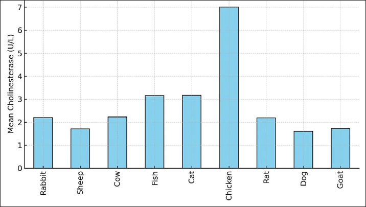 Fig. 2. Histogram illustrating mean of serum ChE levels across nine animal species. Chickens displayed the highest activity, while sheep, goats, and dogs showed the lowest.