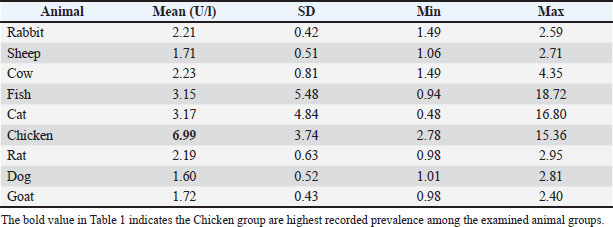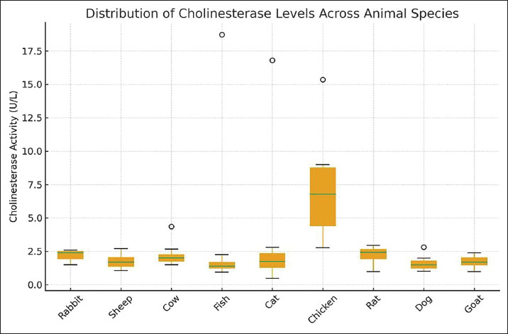 The average species distribution of ChE activity is given by Figure 2, and intra-group variability by Figure 3. From the results, it can be seen that chickens contained much greater enzyme activity than any of the other animals, and the least was in the case of dogs and sheep. Extensive inter-individual range in cats and fish, and less uniform, but narrower enzyme ranges in rabbits and goats, are further pointed out by the boxplot.The chicken group had the highest and most variable levels, followed by sheep, goats, and dogs with the lowest. Outliers are symbolized by circles.