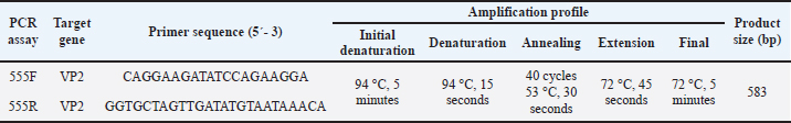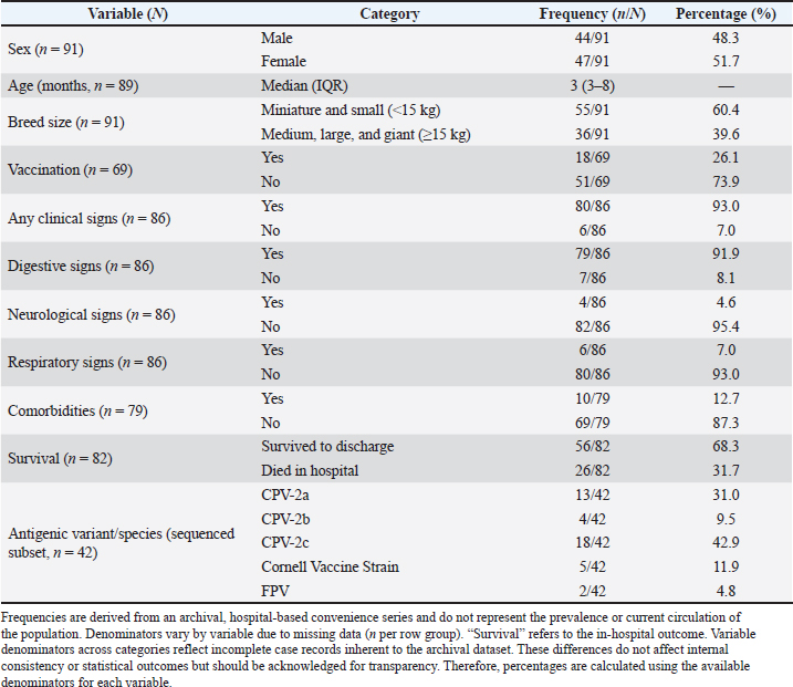 Sequencing and assignment of species/variantsA total of 50 PCR-positive samples were selected for sequencing using a convenience sampling approach, with the criterion of including a minimum of five PCR-positive samples per year (when available) to ensure temporal coverage across 2003–2014 within available sequencing resources. Of these, 42 produced VP2 amplicons of sufficient quality and quantity for downstream sequencing; the remaining samples were excluded due to degraded DNA or unreadable chromatograms in archived extracts. Amplicons were purified using the MinElute® PCR Purification Kit (Qiagen, Germany) and sequenced at the Madrid Technological Park (Faculty of Biological Sciences, Complutense University of Madrid). Sequence inspection was performed in Chromas Lite, and alignment with CPV and FPV reference sequences (NCBI) was performed using MEGA v6. The accession numbers for all reference sequences included in the alignment/phylogenetic reference panel are provided in Table S1. The species designation (CPV-2 versus FPV) was determined based on full-amplicon alignment (583 bp) and phylogenetic clustering with reference panels. The antigenic variants (2a/2b/2c) were assigned according to residue 426, which was not used for species differentiation (Allison et al., 2016). The original alignments and chromatogram files required for robust phylogenetic reconstruction were not retained because of the archival nature of the cohort and the period during which the sequences were generated. Moreover, systematic deposition of sequences in public repositories was not yet standard practice, precluding phylogenetic analysis and representing a limitation of the study. Statistical analysisStatistical analyses were conducted at the individual-patient level (n=99 dogs), using one record per animal. The sample-level dataset (110 samples) was only used for molecular and sequencing analyses. The dependent variable was in-hospital mortality (yes/no). Age was dichotomized at 3 months (≤3 vs. >3 months), corresponding to the sample median and clinical relevance for very young puppies. Descriptive statistics included mean ± SD for normally distributed variables and median with interquartile range for non-normally distributed variables. The Kolmogorov–Smirnov and Shapiro–Wilk tests were used to assess normality. Univariable logistic regression was initially performed to evaluate associations between mortality and independent variables (age, breed size, vaccination status, clinical signs, concurrent diseases, and antigenic variant). Quantitative variables were dichotomized according to the median or clinical plausibility of the dataset; for age, the cutoff was 3 months. Variables with p < 0.10 in univariable analyses, together with clinically relevant factors, were included in a multivariable logistic regression model using stepwise forward selection. For breed size, odds ratios (OR) were coded as small (<15 kg) medium/large/giant (reference). Effects are reported as ORs with 95% confidence intervals (CI). Model calibration was evaluated using the Hosmer–Lemeshow test, and discrimination was assessed using the area under the receiver operating characteristic curve (AUC). Internal validation was performed using bootstrap resampling (100 iterations with replacement) at the patient level, to estimate optimism-corrected model performance and account for within-patient clustering. All analyses were conducted in Stata 15.0, and statistical significance was set at p < 0.05. Analyses were not stratified by year, and temporal trends were not evaluated. Ethical approvalThe clinical veterinary procedures followed were non-experimental under national legislation; owners were informed of the study’s purpose, and informed consent was obtained for the collection of fecal samples from symptomatic dogs and organ samples from deceased individuals (Directive 2010/63/EU; Royal Decree 53/2013). Results and DiscussionThe CPV-2-positive rate obtained in the study was 97.3% (107/110). Frequencies refer to the entire archival period (2003–2014), unless otherwise specified. The positive samples included 101 symptomatic dogs, 4 asymptomatic in-contact dogs, and 2 cats. Sequencing was performed on a subset selected from available samples across years to ensure representation of the 2003–2014 period; the dataset is not population-representative. VP2 amplicons from 42 near full-length samples were successfully sequenced and analyzed. Sequence alignment against CPV/FPV reference panels supported classification as CPV-2a, CPV-2b, CPV-2c, FPV, or the Cornell vaccine strain. Residue 426 informed antigenic-variant assignment, whereas species determination relied on full-amplicon alignment against CPV/FPV reference sequences (Allison et al., 2016). Among the sequenced cases, the variant frequencies were as follows: CPV-2c, 42.9% (18/42); CPV-2a, 31.0% (13/42); Cornell vaccine strain, 11.9% (5/42); CPV-2b, 9.5% (4/42); and FPV, 4.8% (2/42). These frequencies represent archival, hospital-based cases and do not reflect the prevalence or contemporary distribution of the population. The median patient age was 3 months (interquartile range, 3-8 months). Males comprised 48.3% and females 51.6% of the infected animals. Breed distribution included 61% miniature or small breeds (<15 kg) and 39% medium, large, or giant breeds. Gastrointestinal signs (mostly vomiting and diarrhea, frequently hemorrhagic, with dehydration) were observed in 92% of the dogs. Neurological signs (ataxia, tremors, seizures) occurred in 4.6%, and respiratory signs (cough, nasal discharge, dyspnea) in 7.0%. Multisystemic signs likely reflect severe disease and potential co-infections, such as canine distemper virus, which were not systematically excluded. Approximately 7% of the dogs were asymptomatic at the time of testing. Comorbidities, including canine coronavirus or parasitic infestations, were present in 12.7% (Table 2). Table 2. Demographic variables, vac
