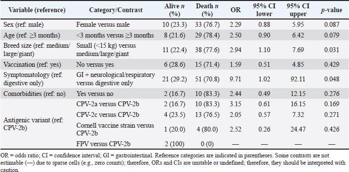 The univariable analysis identified associations between mortality and several variables, including breed size and symptomatology (Table 3). In multivariable logistic regression, small-breed size (<15 kg vs. medium/large/giant: OR 2.74; 95% CI 1.18–6.37) and multisystemic presentation (gastrointestinal plus neurological and/or respiratory signs versus mild: OR 9.14; 95% CI 2.29–36.40) remained independently associated with mortality (Table 4). These estimates indicate a moderate association for small-breed dogs and a strong association for multisystemic disease, albeit with wide confidence intervals reflecting limited precision. Vaccination status was not statistically significant for in-hospital mortality in this hospital-based series of PCR-confirmed CPV infections (unvaccinated vs vaccinated: OR 1.59, 95% CI 0.51–4.85; p=0.429), although the point estimate suggested higher odds of death among unvaccinated dogs (Table 3). Vaccination remains the cornerstone of CPV prevention, and unvaccinated puppies are widely reported to be at increased risk of severe disease. The absence of statistical significance for vaccination status in our analysis should be interpreted cautiously because vaccination histories were incomplete/heterogeneous and the analysis was restricted to infected dogs presenting to the hospital; therefore, these data do not estimate vaccine effectiveness against infection and provide limited power to detect a mortality association among cases. The antigenic variant and comorbidities were also not statistically significant in this dataset (Table 3). The model discrimination was moderate (AUC 0.662; 95% CI 0.527–0.796), indicating that the model supports etiologic interpretation of associations rather than individual-level prognostic accuracy. The calibration was acceptable (Hosmer–Lemeshow p=0.830). The association between small-breed status and mortality is consistent with previous observations in CPV-infected dogs (Ling et al., 2012). Table 3. Univariable logistic regression: mortality by candidate predictors.