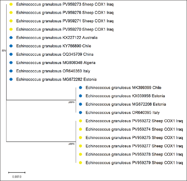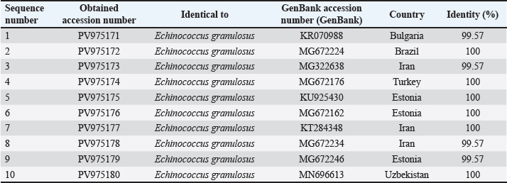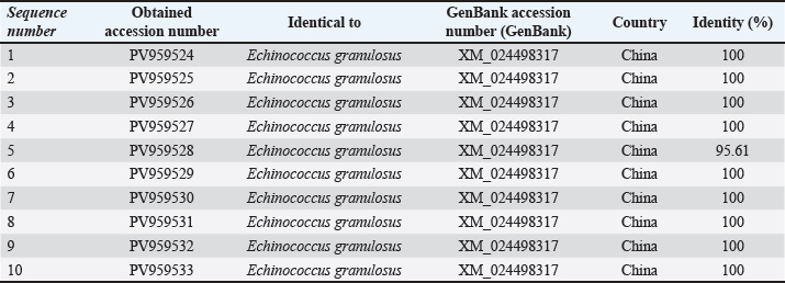 ABSTRACTBackground: Hydatid disease remains a major concern in sheep farming, particularly in endemic areas such as Iraq. Aim: This study aimed to explore the molecular characteristics of Echinococcus granulosus isolated from sheep using multilocus genetic analysis. Methods: Fertile cysts were collected from sheep slaughtered in Diwaniyah and processed for DNA extraction. Four genetic loci—ACT-2, COX1, CYT, and ND1—were amplified by polymerase chain reaction (PCR) and sequenced to evaluate the diversity of the parasite. Results: Each gene yielded fragments of expected lengths, and no contamination was observed in the negative controls. Sequences from sheep isolates were submitted to GenBank, with accession numbers PV959524–PV959533 (ACT-2), PV959270–PV959279 (COX1), PV975191–PV975200 (CYT), and PV975171–PV975180 (ND1). BLAST comparisons revealed identities ranging from 95.6% to 100%, with close matches to isolates from China, Brazil, Estonia, and Turkey. Phylogenetic trees showed clear clustering of local sheep strains with global references, particularly within the G1 lineage. Multiple sequence alignments confirmed a high degree of similarity with minor genetic variation. Conclusion: These results demonstrate the genetic stability of E. granulosus in sheep in southern Iraq and support its inclusion in regional parasite mapping efforts. The data also emphasize the importance of sheep as intermediate hosts contributing to the persistence and spread of this zoonotic parasite. The genetic analysis of E. granulosus from sheep showed close relationships with international strains, reflecting regional transmission and limited sequence divergence. Molecular typing remains essential for the epidemiological control and future vaccine development. Keywords: Alignment, Diagnostic, Liver, Sequencing, Zoonosis. IntroductionCystic echinococcosis (CE) is a disease caused by the larval form of E. granulosus sensu lato (s.l.) (Woolsey and Miller, 2021). This parasite belongs to the tapeworm group. It spreads widely around the world. CE affects both animals and humans. The disease is particularly common in areas where sheep are raised. Sheep often act as intermediate hosts. They get infected when they eat parasite eggs. These eggs hatch and form cysts, mainly in the liver or lungs of sheep. Dogs are the final hosts. They eat infected sheep organs and then pass the eggs in their feces (Manterola et al., 2022). This keeps the infection cycle going. The disease causes significant problems for farmers. Infected animals must be destroyed. This leads to losses in meat production. Farmers also face extra costs for control measures (García-Méndez et al., 2022). In many rural places, such as the Middle East, CE is still common. However, it is often not reported well. Studies using molecular tools have shown that E. granulosus s.l. has different genotypes. The most common species found in sheep is E. granulosus sensu stricto (G1–G3) (Ohiolei et al., 2022). Other types, such as G6 and G7, have also been found in sheep, but they are rare (Hua et al., 2022). Knowing the genotype is essential. It helps in understanding how a disease spreads in a region. Different types may behave differently. Some may cause more harm, affect different animals, or react differently to treatment (Wen et al., 2019; Khademvatan et al., 2019). Research from Europe, Asia, and Africa has shown that sheep strains are genetically similar to those found in other farm animals (Ali et al., 2020; Shams et al., 2022; Casulli et al., 2022a,b). This shows that the parasite easily moves between animals. Nevertheless, differences in parasite types have been found even in the same animal species from different places (Tamarozzi et al., 2020a,b; Borhani et al., 2024). Therefore, it is important to study the parasite locally. Iraq is a country in which such studies are still limited. A good way to study the parasite is through MLG. This method examines more than one gene. It helps to identify differences even within the same genotype. Scientists often use mitochondrial genes such as COX1 and ND1. They also use nuclear genes such as ACT-2 (Aregawi et al., 2024; Gharbi and Giraudoux, 2024). These genes help researchers understand how parasite strains are related. This is useful, especially in areas where the parasite infects many types of animals (Tamarozzi et al., 2020a,b). In Iraq, especially in the south, there are insufficient genetic data about E. granulosus in sheep. This makes it difficult to determine how the parasite is changing or spreading. Conducting more genetic studies on sheep can help. This will improve our understanding of the disease and how it moves between animals (Anvari et al., 2021a,b; Karshima et al., 2022). Sheep are essential in maintaining the parasite cycle. If we do not know which strains are present in sheep, we cannot effectively control the disease (Samei and Khedri, 2025). Good data are needed to make vaccines or deworming programs. Because sheep often live with other animals, they may pass the parasite to others. Studying their role carefully is important. Molecular tools can help us understand how parasites spread between animals and regions (Hua et al., 2022). This study was conducted to provide such information. The genetic types of E. granulosus found in sheep from southern Iraq were examined using PCR and gene sequencing. Materials and MethodsSample collectionFertile hydatid cysts were collected from the liver and lungs of infected sheep during routine postmortem inspection at a slaughter facility. Cysts were microscopically examined to confirm fertility and viability by identifying the presence of protoscoleces and live protoscoleces, respectively (Mokhtaria and Ammar, 2019). Frozen hydatid cysts can replace incineration and sterilize cysts. The germinal layer of each cyst was carefully separated using sterile tools and transferred into labeled Eppendorf tubes. The samples were transported in a cooled c