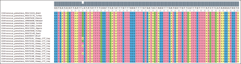 Fig. 9. Multiple sequence alignment of the partial CYT gene in E. granulosus reveals similarities and differences between the identified sequences in sheep Confirmed minimal variation, suggesting a high degree of conservation within this gene in the local sheep population.