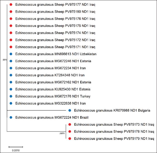 Fig. 11. Echinococcus granulosus evolutionary analysis using the maximum likelihood method targeting the ND1 gene in sheep showed clustering within a conserved lineage, confirming close global relationships.