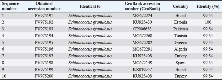 Fig. 5. Evolutionary analysis of E. granulosus using the maximum likelihood method targeting the COX gene in sheep placed within the same clade as these international strains. Alignment results are shown in Figure 6. All 10 samples showed high identity (99.54%–100%) with isolates from Brazil (MG672224), Estonia (KU925430), and Pakistan (OP006658). The phylogenetic tree is shown in Figure 8. ND1 geneThe ND1 gene was amplified in all sheep isolates, producing 344 bp fragments. The agarose gel output is shown in Figures 9 and 10. Sequencing data were submitted under PV975171 to PV975180. The results are shown in Table 5. Identity ranged from 99.57% to 100% compared with strains from Bulgaria (KR070988), Iran (MG322638), Turkey (MG672176), and Uzbekistan (MN696613). The phylogenetic tree is shown in Figure 11. Alignment results are shown in Figure 12. DiscussionThe molecular characterization of E. granulosus isolated from sheep in Diwaniyah revealed strong sequence identity with previously reported global isolates. Our ACT-2 sequences showed 100% similarity with a Chinese reference strain in nine out of ten samples, consistent with the genetic homogeneity observed in many endemic areas (García-Méndez et al., 2022). These findings support the view of García-Méndez et al. (2022) who indicated that the proteomic and genetic profiles of E. granulosus tend to be highly conserved in dominant hosts, such as sheep. Our COX1 gene data followed a similar pattern, closely aligning with isolates from Europe and South America. This resembles the camel-based genotyping trends documented by Anvari et al. (2021a,b) where genetic uniformity across continents was also evident. Despite the geographical distance, sheep strains from Iraq share a high genetic affinity with those from Brazil, Estonia, and China, demonstrating the global stability of the G1 genotype.