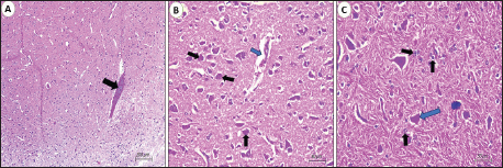 Fig. 1. Photomicrograph of the cerebrum of AEV-infected broiler chickens. (A) Lymphocytic encephalitis with perivascular cuffing (arrow). (B) Central chromatolysis of neurons (black arrows) and vasogenic edema (blue arrow). (c) Central chromatolysis of neurons (blue arrow) and astrocytosis (black arrows) (hematoxylin and eosin stain, Scale bar 200 μm). Neuronal degeneration and necrosis, accompanied by neuronophagia, were frequently observed, characterized by focal aggregation of activated microglial cells phagocytosing degenerated or necrotic neurons, particularly within the cortical layers. Additionally, affected areas demonstrated gliosis, which was manifested by the conspicuous proliferation and hypertrophy of microglial cells and astrocytes, reflecting a reactive glial response to neuronal injury. Prominent central chromatolysis was noted in multiple neurons, characterized by peripheral displacement of the neuronal nucleus and dissolution or loss of Nissl substance from the central cytoplasm, indicative of viral neurotropism-associated axonal injury and metabolic stress. Mild interstitial edema was present within the neuropil in some sections, further contributing to tissue disruption. Histopathological examination of the proventriculus (Fig. 2) revealed mild to moderate lymphocytic infiltration within the lamina propria and submucosa in approximately 50% of the examined samples. This infiltration was occasionally associated with submucosal edema and mild interglandular connective tissue expansion. In certain cases, the mucosa exhibited degenerative changes, including focal glandular epithelial atrophy and mild epithelial vacuolation, suggestive of chronic inflammatory insult. Histological sections of the gizzard revealed multifocal lymphocytic infiltration involving the submucosa and extending into the muscular layer. These inflammatory foci often accompanied by mild vascular congestion of mucosal and submucosal capillaries, without evidence of hemorrhage or necrosis. In most cases, the koilin layer remained largely intact, indicating a predominantly inflammatory rather than erosive process.