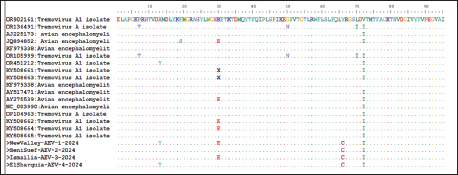 Fig. 5. Alignment of the VP1 amino acid sequences from the four Egyptian AEV isolates and the reference strains. The top row shows the amino acid positions in the YEBIO-HeN141 VP1 sequence. Letters denote amino acid substitutions, dots (.) represent identical amino acids, and dashes (−) indicate alignment gaps. DiscussionIn Egypt, there are many viral infections, causing multiple outbreaks with considerable impact on animal and poultry health (Abd El Hafez et al., 2021; Badr et al., 2022; Ramzy et al., 2024). These viral outbreaks have predominantly resulted from RNA viruses, causing remarkably devastating economic losses in the poultry sector (Amal et al., 2019; Abodalal et al., 2021; Ahmed et al., 2025). Since its first recorded outbreak in the USA in 1932, AEV has been a major concern and a globally prevalent disease causing substantial economic losses to the poultry sector in Africa, Asia, Australia, Europe, and the Americas (Xue et al., 2016; Zhang et al., 2023; Wang et al., 2023; Zhang et al., 2024). AEV has persisted on poultry farms for extended periods despite routine vaccination across different districts of Egypt, which is accomplished by vaccinating poultry flocks against AEV during the growing period. At present, AEV prevention is predominantly based on vaccine strategies. Thus, strengthening the farm’s daily feeding practices and biosecurity protocols, enhancing the breeding environment, and preventing secondary infection are essential (Lin et al., 2018; Sarma et al., 2019). This study aimed to isolate and genetically characterize all available AEV isolate sequences and other commercially available vaccines in four Egyptian governorates to guide AEV prevention and control. To the best of our knowledge, no report has been performed mainly on AEV in broilers in Egypt. The present study was conducted in broiler flocks due to the increasing occurrence of neurological manifestations and economic losses reported in young broilers in Egypt. Broilers represent a highly sensitive indicator of circulating field strains because they are typically not routinely vaccinated against AEV and therefore reflect exposure to natural viruses. Consequently, broilers were selected to better characterize the currently naturally circulating field AEV strains and to evaluate their genetic relationship with vaccine strains used in breeder flocks. As depicted in our findings, the AEV-positive flocks with a prevalence rate of 5.3% showed clinical mild neurological symptoms in young infected chicks, whereas in adult birds, they only showed transient decreases in egg productivity and hatchability, with a mortality rate ranging from 4% to 8% with non-specific necropsy in the investigated birds. These current findings came in accordance with previously reported clinical manifestations (Taunde et al., 2017; Gethoffer et al., 2021; Zhang et al., 2024; Al-Hammadi and Al-Rasheed 2024; Temeeyasen et al., 2024; Xu et al., 2025). Generally, AEV-gross lesions were mild, which is in agreement with previous evidence that the disease had a preponderant clinical presentation of functional impairment of the central nervous system over enormous macroscopic pathology (Temeeyasen et al., 2024; Xu et al., 2025). The most notable gross changes were impacted crops or gizzards, which are responsible for feeding difficulties due to tremors or bird paralysis. Additionally, these changes are considered to be secondary manifestations of neurogenic dysfunction and have been reported in AEV infections (Xu et al., 2025). The apparent lack of visible lesions within the brain despite extreme neurologic presentations reflects the requirement for microscopic examination in the diagnosis of AEV. This dilemma of AEV diagnosis was mainly histopathology and accurate molecular confirmation (Torre et al., 2018; Ghalyanchilangeroudi et al., 2024). Regarding the pathological dissection of the dead birds, changes in lymphocytic encephalomyelitis, particularly in the cerebrum, including perivascular lymphocytic cuffing, neuronal degeneration, neuronophagia, and gliosis, were observed. These lesions were the same as the current pathological situation previously described in the AEV experimental and natural infection (Hauck et al., 2017; Zhang et al., 2024). One of the characteristic lesions identified in this study was central chromatolysis in motor neurons of the cerebrum, a normal change indicating axonal damage or viral-mediated metabolic stress. The observations in this study also align with the findings of previous studies (Temeeyasen et al., 2024; Ghalyanchilangeroudi et al., 2024). This feature was observed in AEV as a response to viral replication in neurons and other neurotropic viral infections (Diab et al., 2019; Mohamed et al., 2025). Although the CNS remains the predominant target, slight to moderate lesions, including submucosal lymphocytic infiltration and glandular epithelial degeneration, were observed in the proventriculus and gizzard. They can point to viral effects on the enteric nervous system or ganglia, as AEV grows in the peripheral ganglia and autonomic plexuses (Shafren and Tannock, 1991). Concerning SPF-ECE inoculation, AEV-inoculated embryos exhibited typical pathological changes in the form of leg stiffness and encephalomalacia. These subsequent results were in line with those of previous studies (Shafren and Tannock, 1991; Taunde et al., 2017; Goto et al., 2019). More importantly, the RT-PCR results with AEV-specific primers revealed 8 positive samples. These current molecular results are closely similar to those of previous studies (Liu et al., 2014; Goto et al., 2019; Zhang et al., 2024; Ramzy et al., 2024). Subsequently, no co-infection with NDV, IBV, ILT, and IBDV was identified. These subsequent findings are not consistent with the reports of Zhang et al. (2024), who reported the prevalence rates of Mycoplasma synoviae and Gyrovirus galga1 as 5.71% and 2.86%, respectively. Particularly, to investigate the evo
