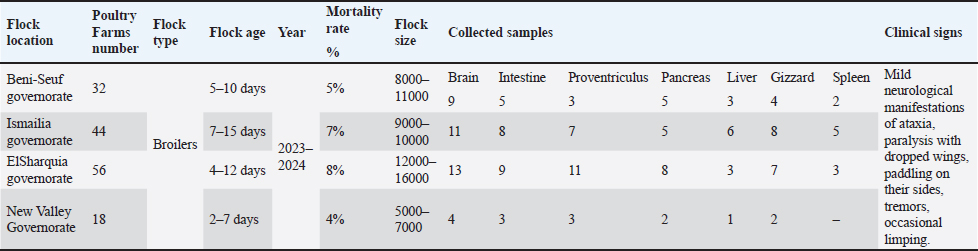 ABSTRACTBackground: Avian encephalomyelitis (AE) is an imperative viral disease of avian species worldwide caused by the AE virus (AEV). Aim: This retrospective study aimed to genetically characterize field AEV strains circulating in the local governorates of Egypt and assess their genetic divergence in comparison with commercially available vaccines. To the best of our knowledge, this is the first described study of AEV-VP1 gene sequencing and phylogeny in broilers in Egypt. Methods: A total of 150 tissue specimens from broilers of four Egyptian governorates were used for isolation and genetic characterization. The samples were tested for other pathogens, including egg drop syndrome virus, Newcastle disease virus, avian reovirus, avian reticuloendotheliosis virus, infectious bronchitis virus, Chicken anemia virus, and Marek’s disease virus. Results: Young chicks showed neurological symptoms and a mortality rate of 4%–8%. Only crop impaction and distended proventriculus were observed in sick chicks. Histopathological findings revealed typical lesions of lymphocytic encephalomyelitis in the cerebrum with mononuclear cuffing of perivascular spaces in the cortex and medulla. The proventriculus revealed mild lymphocytic infiltration within the submucosa. Typical pathological changes in leg rigidity and encephalomalacia were observed in specific pathogen-free embryonated chicken eggs (SPF-ECE). Regarding reverse transcriptase quantitative polymerase chain reaction (RT-qPCR), 8 (8/150) samples were positive with a prevalence rate of 5.3%, and the screening results were negative for other viral infections. The 4 selected positive samples were amplified using a one-step conventional RT-PCR assay for partial sequencing of the AEV-VP1 gene. Interestingly, the phylogenetic analysis exhibited that AEV isolates belong to cluster II within the same clade of Chinese strains and have a genetic similarity to Chinese, Iranian, American vaccinal, and British isolates, with 94%–98%a nucleotide similarity, and 96%–99% amino acid identity. Conclusion: Continuous monitoring and potentially updating the vaccination strategies in a timely manner are necessary to ensure vaccine effectiveness as an efficient control strategy in poultry flocks. Keywords: Avian encephalomyelitis virus, Young chicks, VP1 gene, Sequencing, Broilers. IntroductionAvian encephalomyelitis (AE) is a highly contagious viral disease that affects several avian species, including chickens, turkeys, pigeons, and quails. The disease is caused by the AE virus (AEV), which spreads readily among susceptible birds (Swayne et al., 2017; Hauck et al., 2017). AE typically manifests at an early age in broilers, most commonly between 1 and 3 weeks of age. Clinical disease may appear as early as 3–7 days after hatching, particularly in cases of vertical transmission from infected breeder hens. AEV is clinically characterized by typical neurological symptoms, such as ataxia, paresis, paralysis, muscular dystrophy, abnormal gait, and rapid head and neck tremors, with high morbidity and variable mortality in young infected chicks (Ali et al., 2021; Zhang et al., 2023). In addition, tremovirus A comprises two distinct strain categories: a natural enterotropic strain that usually infects the offspring of chicks and a neurotropic embryo-adapted strain. AEV transmission can occur horizontally via the fecal-oral route and vertically by infected embryonated eggs. In particular, vertical transmission leads to the development of pronounced neurological signs in newly hatched chicks and poses a serious risk to the poultry sector. The disease prevalence in affected birds ranged from 40% to 60%, with an average mortality rate of 25%. In contrast, AVE infection in adult birds is typically subclinical and is mainly associated with reduced egg production and decreased hatchability of fertile eggs, without neurological manifestations (Torre et al., 2018; Zhang et al., 2023). AEV is structurally classified within the genus Tremovirus of the family Picornaviridae (Ali et al., 2021). Its genome consists of a single-stranded, positive-sense RNA approximately 7.5 kb in length and contains a single large open reading frame (ORF) that encodes a polyprotein precursor (Ali et al., 2021). Similar to other picornaviruses, this polyprotein precursor is subsequently cleaved by intracellular proteases into three primary precursor proteins—P1, P2, and P3—yielding 11 structural and non-structural proteins. The P1 region encodes the four major structural proteins VP4, VP2, VP3, and VP1, whereas the P2 and P3 regions encode the nonstructural proteins 2A, 2B, 2C, 3A, 3B, 3C, and 3D (Lin et al., 2018). Notably, the VP1 capsid protein within the P1 region serves as a genetic diagnostic marker for AEV and constitutes the principal immunogenic protein responsible for inducing protective host immune responses (Wei et al., 2008; Hauck et al., 2017). Since the AEV outbreak was identified in the United States of America in 1930, it has achieved a worldwide endemic distribution, with sustained circulation reported across North America, Europe, Asia, Africa, the Middle East, and South America, particularly in regions with intensive poultry production (Braune and Gentry, 1971; Wang et al., 2023). Generally, AEV infection is confirmed either by detecting the virus through molecular diagnostic methods, including polymerase chain reaction, or by isolating the virus (Haryanto et al., 2016; Senties-Cue et al., 2016; Goto et al., 2019). Furthermore, serological assays, such as agar gel diffusion, virus neutralization, and chicken embryo susceptibility tests, can support diagnosis when interpreted alongside clinical findings (Pohjola et al., 2017; Taunde et al., 2017; Ali et al., 2021; Gethoffer et al., 2021). At present, no specific antiviral treatment is available; therefore, vaccination regimes remain the most effective strategy for AEV control and are significant in minimizing losses (Lin et