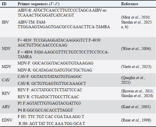Histopathological examinationTissue specimens (brain, proventriculus, and gizzard) were collected microscopically immediately after necropsy and fixed in neutral-buffered formalin (10%) for 24–48 hours to ensure adequate tissue preservation. Tissues were trimmed, washed, dehydrated in a graded ethanol series (70%, 80%, 90%, 95%, and 100% ethanol), cleared, and embedded in paraffin wax using standard histological procedures. After sectioning the paraffin blocks at a thickness of 4–5 μm using a microtome. The obtained sections were mounted on glass slides, deparaffinized, rehydrated through descending grades of ethanol, and stained with hematoxylin and eosin (H&E) according to routine protocols. Finally, the stained sections were examined microscopically for histopathological alterations using a light microscope (Fotouh et al., 2024). AEV isolationThe supernatants of tissue homogenate (0.2 ml) were inoculated via the yolk sacs (5 ECE/sample) into 5–7-day-old specific pathogen-free embryonated chicken eggs (SPF-ECE), purchased from SPF farms located in Koom Oshiem region, Fayoum governorate, Egypt (Hoekstra, 1964), and then incubated at 37°C. The chicks were monitored daily for any AEV-associated signs during the first 10 days post-inoculation (PI). Consequently, once clinical signs were monitored, the six brain homogenates collected from six infected chicks were further centrifuged at 12,000 rpm for 10 minutes. Finally, the AEV isolate remained in the subsequent supernatants. A previously confirmed AEV reference strain (molecularly verified by RT-PCR) was used as a positive control to validate the virus isolation procedure. Ten SPF chicken embryos were used as the negative control with 0.1 M PBS (pH=7.4). RNA extraction and conventional reverse transcriptase polymerase chain reactionParticularly, the viral RNA was extracted promptly from positive samples using the QIAamp Viral RNA Mini Kit (Qiagen, Hilden, Germany) according to the manufacturer’s recommendations. A subset of confirmed positive isolates (n=8) was subjected to partial amplification of the VP1 gene using a conventional reverse transcription-polymerase chain reaction assay kit (Qiagen, Hilden, Germany) according to the manufacturer’s instructions. Amplification was performed using a specific primer pair (AEV-Forward: 5′-GAATTAGCTCCTGGTAAACCTCG-3′ and AEV-Reverse: 5′-CTCTATCGCAACACCCTCAGG-3′), targeting a 288-bp fragment of the VP1 genomic region (Zhang et al., 2024). Differential of AVE from other pathogens using RT-qPCRMoreover, all PCR-positive samples were screened for avian viral pathogens, including Egg drop syndrome virus (EDSV), Avian reovirus (ARV), Newcastle disease virus (NDV), avian reticuloendotheliosis virus (REV), Infectious bronchitis virus (IBV), Chicken anemia virus (CAV), and Marek’s disease virus (MDV), were also examined by RT-qPCR protocols, to differentially confirm the presence of AEV (Table 2) (Raue et al., 1998; Kant et al., 2003; Wise et al., 2004; Meir et al., 2010; Biswas et al., 2011; Mosad et al., 2021; El-Khabaz et al., 2021; Quaglia et al., 2021; Varte et al., 2023; Zhang et al., 2024; Shosha et al., 2024; Shosha et al., 2025). Table 2. Consensus oligonucleotide primers were subjected to RT-PCR amplification of other related pathogens.