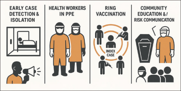 Fig. 3. Summary of Ebola outbreak control measures. Control efforts begin with the rapid detection of confirmed cases and strict isolation of infected patients (Onyekuru et al., 2023). Rapid diagnosis using RT-PCR and antigen detection allows for immediate quarantine to prevent further transmission (Broadhurst et al., 2016). All patients with suspected or confirmed EVD must be treated in high-biosafety facilities (minimum BSL-3) that implement strict infection control protocols (Zhang et al., 2017). Medical personnel are required to wear full PPE, including respirators, face shields, double gloves, and fluid-resistant gowns (Weber et al., 2015). Cross-contamination is prevented through proper donning and doffing procedures and routine disinfection with a chlorine-based disinfectant, such as a 0.5% sodium hypochlorite solution (Smither et al., 2016). Community-level control efforts emphasize education about transmission mechanisms, early signs of disease, and preventive measures, including avoiding direct contact with patient fluids or corpses (Jalloh et al., 2017). Risk communication and community empowerment programs have proven effective in increasing compliance with prevention protocols, particularly in areas with strong traditional practices and beliefs (Kusena et al., 2024). Safe and dignified burial practices are crucial, as many previous EVD outbreaks have been exacerbated by traditional burial rituals that involve direct contact with the body (Sikakulya et al., 2021). These procedures include wrapping the body in a fluid-tight bag and ensuring no direct contact with mourners, while respecting local cultural values (Warsame et al., 2023). Because EVD is a zoonotic disease, control of animal reservoirs is crucial (Mirazimi, 2015). Fruit bats have been identified as the primary reservoir, so direct interaction between humans and wildlife should be minimized (Leendertz et al., 2016). Governments in endemic areas are encouraged to prohibit the trade and consumption of bushmeat, particularly from primates and bats (Pooley et al., 2015). Furthermore, ecological surveillance and virus monitoring in wildlife populations are crucial to detect potential spillovers before infections spread to humans (Fauziah et al., 2024). Furthermore, medical and biological waste from EVD patients must be managed according to biosafety and biosecurity protocols (Hewlett et al., 2015). All contaminated materials, including disposable medical devices and protective clothing, must be autoclaved or incinerated at high temperatures to completely inactivate the virus (Elveborg et al., 2022). The EVD outbreak was handled by establishing a multidisciplinary emergency response team involving health authorities, international organizations (such as the WHO and CDC), and humanitarian agencies (Reece et al., 2017). Key strategies in the outbreak response included: active surveillance and contact tracing to identify at-risk individuals and break the chain of transmission; decontamination of exposed areas and management of infectious waste; 21-day quarantine and monitoring of individuals who had contact with patients; and provision of medical logistics and temporary isolation facilities in affected areas (Gupta et al., 2021). An approach that directly involves communities, including the role of traditional and religious leaders, is crucial for building public trust, increasing transparency, and encouraging compliance with quarantine policies and vaccination programs (Dada et al., 2019). Future challenges and prospectsDespite significant progress in the detection, control, and treatment of EVD, numerous scientific and operational challenges remain that hamper efforts to eliminate the disease globally (Singh et al., 2017). One major obstacle is the virus’s long-term persistence in survivors in immunoprivileged tissues, such as the testes and eyes, potentially triggering relapses or re-emergence of outbreaks after disease-free periods (Jacob et al., 2020). This situation emphasizes the importance of developing long-term surveillance strategies for survivors to prevent undetected secondary transmission (Den Boon et al., 2019). Furthermore, limited health infrastructure in endemic areas, particularly in Sub-Saharan Africa, presents significant obstacles to rapid diagnosis, intensive care, and vaccine distribution (Kebenei and Okoth, 2021). Dependence on international assistance emphasizes the importance of strengthening local laboratory capacity, training medical personnel, and engaging communities in epidemiological preparedness (Gunnlaugsson et al., 2019). Additional challenges include social and cultural resistance to public health interventions, such as traditional burial practices and mistrust of vaccines, which can exacerbate disease spread during outbreaks (Manguvo and Mafuvadze, 2015). From a scientific perspective, continued research into the genetic evolution and molecular dynamics of the Ebola virus is crucial for understanding how the virus adapts to human and animal hosts (Ndayambaje et al., 2024). Moving forward, the development of multivalent vaccines and combination therapies capable of providing long-term protection against various Ebolavirus strains will be a key focus. Implementing a One Health approach, strengthening global surveillance systems, and cross-sector collaboration are key factors in building a resilient response to high-risk infectious disease threats like EVD (Choi and Croyle, 2013). ConclusionEVD is a highly virulent zoonotic disease with a significant impact on global public health. Its characteristics, including rapid transmission, high mortality, and potential for re-emergence, emphasize the need for an integrated control strategy based on the One Health principle. Efforts such as early detection, strict isolation, implementation of biosafety protocols, and vaccination have proven effective in limiting the spread of outbreaks. Furthermore, strengthening laboratory capacity, active survei