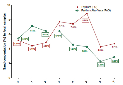 Fig. 1. Sand concentration in fecal samples from horses treated with psyllium or psyllium with aloe vera extract on the day of treatment and 7 days after the start of treatment. DiscussionSand enteropathy is a persistent challenge in horses raised in sandy environments, such as those in Saudi Arabia (Al-Ghamdi, 2008; Turek et al., 2019). This study aimed to evaluate the combination of aloe vera with psyllium (PAG) compared with conventional psyllium alone (PG) to determine whether the purported anti-inflammatory and mucosal-protective properties of aloe vera are effective in enhancing sand clearance and mitigating the systemic effects of sand impaction and movement. Our results are consistent with studies indicating that combination treatments are often more effective at achieving optimal sand removal while reducing the negative effects of single treatments (Niinisto et al., 2014; Niinisto et al., 2018). The combination of magnesium sulfate with psyllium has shown encouraging results in intestinal sand expulsion through a prokinetic effect (Niinisto et al., 2014), whereas the combination of aloe vera extract is fundamentally different. Aloe vera gel is rich in polysaccharides and glycoproteins, which have anti-inflammatory and wound-healing effects on the intestinal mucosa (Kim et al., 2019; Naini et al., 2021). Combining aloe vera gel with psyllium creates a synergistic effect. Psyllium acts as a propellant and mobilizer for sand by absorbing water (Kaikkonen et al., 2016; Niinisto et al., 2018), while aloe vera gel reduces irritation and spasm by soothing the colonic lining (Salim et al., 2024). Aloe vera may also reduce local smooth muscle spasm, improving the propulsive movement required to move heavy sand through the intestine (Haasbroek et al., 2019). The natural lubricating properties of aloe vera may help lubricate the intestinal lining, allowing the dense psyllium-sand mixture to flow through without causing friction and erosion in the intestinal lining. In contrast, the amount of sand excreted in the horses’ feces during the treatment period was greater in the group receiving psyllium alone than in the group receiving psyllium with aloe vera (Fig.1), which may have affected the treatment period. These results could be explained by the fact that aloe vera has a viscous effect (Shokraneh et al., 2016) and may delay sand expulsion, or that the anti-inflammatory properties of aloe vera may reduce intestinal motility (Naini et al., 2021; Salim et al., 2024), which may delay sand excretion. Conversely, the lower overall mean and reduced variability in PAG suggest a more consistent effect across the group, potentially indicating a treatment that is less subject to individual variations in gut motility or sand impaction severity. Both groups showed a final decrease in WBC counts by day 14, indicating that the chronic inflammatory condition caused by sand accumulation was successfully resolved. In the PG group, this decrease was stable and sustained. However, the PAG group showed an initial, temporary increase in WBC counts by day 7 before stabilizing at a final count (5.3 ± 0.33 × 109/l) lower than the final count in the PG group (6.2 ± 0.047 × 109/l). This suggests that the PAG combination may lead to a more profound resolution of chronic inflammation (Fehrmann-Cartes et al., 2019; Salim et al., 2024). The Ly% and neutrophils was notable in this study. A significant increase in lymphocytes and a decrease in neutrophils were observed in the first and second weeks of treatment in the PAG (Table 2), whereas an increase in the neutrophil percentage and a decrease in the lymphocyte percentage were observed in the PG (Table 1). These results confirm that the increased lymphocyte count in the psyllium-aloe vera group indicates an improved immune response during sand expulsion and its effect on reducing inflammation (Fehrmann-Cartes et al., 2019; Haasbroek et al., 2019; Akanmu et al., 2020), evident in the decreased neutrophil count in the same group. However, the high NE% and low Ly% in the group treated with psyllium alone (PG) indicate inflammatory activity during sand movement and a decline in the horses' immunity levels. These results may be explained by the fact that aloe vera contains components that interact with the immune system (Fehrmann-Cartes et al., 2019; Naini et al., 2021), the presence of which may induce a temporary mobilization of gut-associated lymphoid tissue, as the physical irritant and the new mucosal barrier are removed from the gastrointestinal tract. Moreover, the elevated lymphocyte percentage in PAG compared to PG indicates a deeper systemic immunomodulation, possibly associated with the immune response of the gut to the significant dietary change and the introduction of a new, biologically active substance (Sánchez et al., 2020). Eosinophils are key players in hypersensitivity reactions and an immune response directed toward mucosal surfaces and tissue repair (Rotting et al., 2008; Brosnahan, 2020). The consistent increase in EO% up to 3.3% ± 0.44% by day 14 in the PAG group strongly supports the hypothesis that the aloe vera component triggers a favorable, yet unique, immunological response related to mucosal healing (Panahi et al., 2020). The RBC count, Hb, and HCT levels decreased in the PAG group compared with those in the PG group, with values returning to near-baseline by day 14. One possibility is that this reflects a mild, transient hemodilution effect if the horses in the PAG group were in a more hydrated state systemically, possibly due to the effect of aloe vera on fluid dynamics within the gut, thereby diluting the blood components (Akanmu et al., 2020; Maiuolo et al., 2022). The interpretation of these promising results must be viewed considering the limitations of the study. First, the sample size of n=7 per group is relatively small and limits the statistical power of the study. Second, fecal sand analysis provides a measure of excretion, b