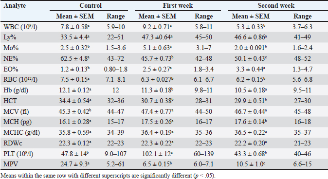 Table 2. Mean, SEM, and range of hematological values before treatment and 7 and 14 days after the start of treatments with psyllium husk powder and aloe vera (PAG) in horses affected by sand accumulation. p values calculated between parameters in control camels before and 7, 14 days after the start of treatment.