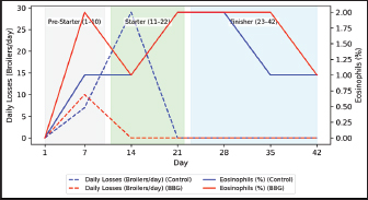 Fig. 5. Temporal relationship between daily mortality and eosinophil count in broiler chickens.