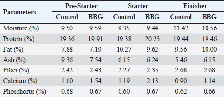 Ethical approvalInstitutional and national guidelines for the care and use of laboratory animals were followed in compliance with ethical standards, following the guidelines of the Bioethics Committee for Animal Research of the Venezuelan Institute for Scientific Research (COBIANIM 2025; May 13, 2025). ResultsAnalysis of diet and water qualityThe bromatological analysis of the diets developed for the three growth phases (pre-starter, starter, and finisher) (Table 1) confirmed that all nutritional levels were comparable between treatments. This consistency ensured that the diets were isoproteic and isoenergetic, meeting the specific nutritional requirements for each developmental stage. Table 2 shows the physical and chemical parameters of the water supplied to the broilers. Noncompliance with regulatory standards was identified for free residual chlorine, pH, and nitrate. Specifically, the absence of residual chlorine (0 mg/l) and the high nitrate concentration (34.53 mg/l NO3) indicate that the drinking water deviates considerably from the optimal values for poultry farming. Productive performanceTable 3 and Figure 1 summarize the production parameters evaluated throughout the three growth phases (Pre-starter, Starter, and Finisher) for both treatments (Control and BBG). In the pre-starter phase, the IBW was 38.64 ± 0.83 g for the Control and 39.22 ± 0.66 g for the BBG treatment, indicating no differences in the initial weight between the treatments. At the end of this phase, the FBW of the BBG treatment was higher (276.00 ± 88.50 g) compared to the Control (265.80 ± 81.57 g). The DFI was 25.11 ± 7.59 g for the Control and 40.77 ± 9.46 g for the BBG, while the BWG was 227.16 g and 236.78 g. The FCR was 0.75 and 0.40 for the control and BBG treatments, respectively. Mortality was notably higher in the control treatment (20.45%) than in the BBG treatment (9.85%), suggesting an increase in field challenge that affected both treatments, although the control showed a disproportionately greater impact. No significant differences were observed between treatments during this phase (p > 0.05). During the starter phase, the IBW was 265.80 ± 81.57 g for the Control and 276.00 ± 88.50 g for BBG, maintaining the trend of a higher FBW in the BBG treatment (1,127.20 ± 329.2 g) compared to the Control (1,092.07 ± 321.45 g). The DFI was 98.95 ± 20.33 g for the Control and 80.02 ± 25.36 g for the BBG, while the BWG was 826.27 g and 851.20 g. The FCR was 0.99 for the control and 0.84 for the BBG treatment, indicating better feed efficiency in the latter. Mortality in this phase was absent in the BBG treatment (0.00%) compared with 6.06% in the control group. Statistical analysis indicated no significant differences during this phase (p >0.05). In the finisher phase, the IBW was 1,092.07 ± 321.45 g for the Control and 1,127.20 ± 329.2 g for the BBG. At the end of the study (day 42), the FBW of the BBG treatment reached 3,078.00 ± 449.79 g, surpassing that of the control treatment, which recorded 2,743.88 ± 347.58 g. The DFI in this phase was 214.90 ± 22.77 g for the Control and 197.04 ± 14.23 g for the BBG, resulting in a BWG of 1,651.81 g and 1,950.80 g, respectively. The FCR was 1.53 for the control group and 1.59 for the BBG group. No mortality was observed in either treatment group during this phase. Statistical analysis showed no significant differences between treatments (p > 0.05). Overall, the treatment with BBG inclusion consistently showed higher FBW and BWG, as well as improved FCR during the pre-start (0.40 vs. 0.75) and starter phases (0.84 vs. 0.99), although the latter was slightly higher in the finisher phase (1.59 vs. 1.53). Notably, mortality was significantly lower in the early phase of BBG treatment, suggesting a protective effect against initial environmental challenges. Hematological profileIn the hematological analysis, the blood count results for broilers in both control and BBG treatments showed variations compared with the established reference values. Reference values: Leukocytes: 4,000–40,000 (cells/µl or mm³), Segmented cells: 20–50 (%), Lymphocytes: 45–75 (%), Eosinophils: 0–2 (%), Monocytes: 2–10 (%). In the Control treatment, leukocytes consistently exceeded the reference range at most sampling points, with peak values of 90,871 cells/μl (day 14), 59,583 cells/μl (day 21), and 45,117 cells/μl (day 42). This indicates a marked leukocytosis, suggesting chronic inflammation or an infectious process (Fig. 2). Segmented cells (heterophils) were above the reference range on days 7 (51%) and 35 (55%) (Fig. 3). Lymphocytes remained within the reference range, except on day 35 (42%) (Fig. 4). Eosinophils remained within the range throughout the study (Fig. 5), whereas monocytes were below the reference range on days 7 (1%) and 42 (1%) (Fig. 6). In the BBG treatment, leukocytes exceeded the reference range at all sampling points, with values ranging from 24,500 cells/μl (day 28) to 66,369 cells/μl (day 14) (Fig. 2). Segmented cells remained within the range, except on days 14 (52%), 21 (55%), and 35 (53%), when they were slightly above the upper limit (Fig. 3). Lymphocytes were within the reference range at all sampling points (Fig. 4), indicating a more stable immune response compared with the control. Eosinophils were within the range throughout the study (Fig. 5), whereas monocytes were below the reference range on days 21, 35, and 42 (1%) (Fig. 6). Both treatments showed markedly elevated leukocyte levels relative to the reference values throughout the study. Although segmented cell and lymphocyte trends varied, they remained mostly within or near the established ranges for both treatments. Blood biochemistryThe results of blood biochemistry analyses for broiler chickens in the control and BBG treatments are detailed in Table 4. Various alterations were observed compared with the established reference values. In the control group, blood glucose l