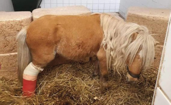 Fig. 2. Image of the pony a few days after surgery with the immobilization on the right hindlimb reinforced by the application of a full limb cast.