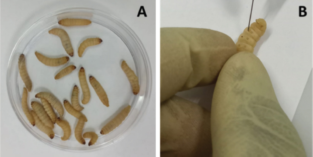 Stock solutionsOne gram of each crude extract was dissolved in 5 ml of sterile phosphate-buffered saline (PBS) to obtain the concentration of 200 mg/ml. These solutions were sterilized by microfiltration (0.22 μm) and dilutions were performed in sterile PBS to obtain concentrations of 150, 100, 50, 25, 12.5, and 5 mg/ml. The sterile PBS plant extract free was used as control. All the eight tests solution were stored at 4°C. Toxicity assayThe larvae were weighed and only those from 0.2 to 0.5 g were retained. For each concentration of extract, 3 groups of 20 randomly selected GM larvae were used (Fig. 1A). 20 μl of each dilution were injected using a 0.3 ml Terumo® Myjector® U-100 insulin syringe (VWR, Russia) through the base of the last left proleg as described by Megaw et al. (2015), and shown in Figure 1B. Control groups of 10 larvae injected with 20 μl sterile PBS were also included. After 24 hours of incubation in the dark at 37°C, larvae were examined for mortality, and were considered dead if they were unmoving, failed to reorient themselves when placed on their backs, and failed to respond to stimuli as indicated by Megaw et al. (2015). Percentage survival was plotted as a function of concentration for each plant extract sample using Spline cubic model in the statistical software XLSTAT 2020 (Addinsof Inc., New York) and median LD50, LD90 and LD100 values expressed in mg/ml were calculated using each specific spline cubic equation or spline cubic curves obtained. Spline curves were used when the fit accuracy of the spline equation was less than 90%). The mean weight of each group of 20 larvae was used to extrapolate the LD50, LD90 and LD100 values for each plant extract sample in g/kg using the formulas: