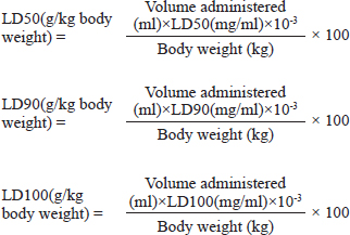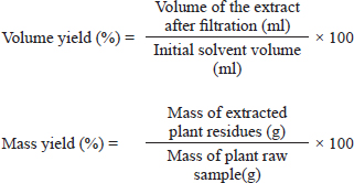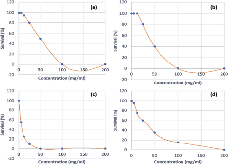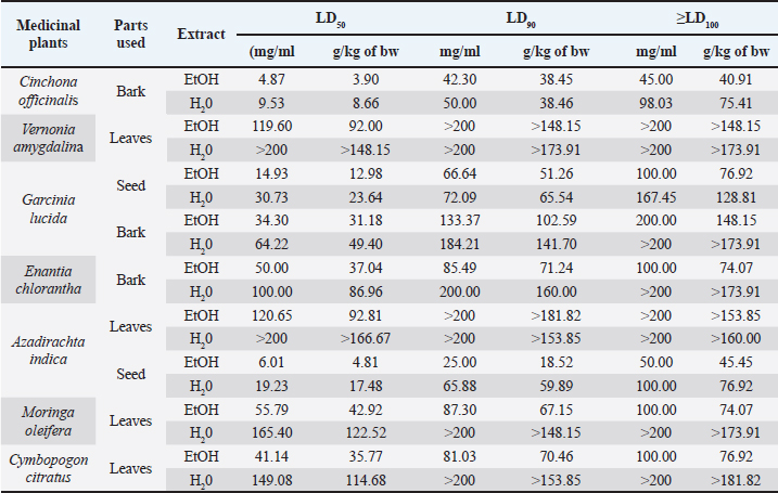 Results and DiscussionThe extract yields obtained for the nine samples from our seven medicinal plants using ethanolic solution and distilled water are recorded in Table 1. As observed in Table 1, the highest volume yields were observed with ethanolic extracts while the highest mass yields were obtained with aqueous leaves extract of M. oleifera (21.2%), C. citratus (17.3%), A. indica (15.1%), and V. amygdalina (14.0%). The highest mass yield with ethanolic solution was obtained with E. chlorantha bark (12.4%). Extraction with ethanolic solution was less effective in A. indica seed and M. oleifera leaves with mass yields of 5.8% and 7.3%, respectively. In most of the studies where extraction of active compounds was performed, it was reported that water had a better extraction rate than other solvents such as ethanol or methanol (Arsene et al., 2021; Mbarga et al., 2021; Mouafo et al., 2021). Mouafo et al. (2021) reported that this difference is mainly attributed to the polarity of the solvents and therefore to the large proportions of water-soluble compounds present in the plant. However, high yields of phytoconstituents obtained does not necessarily imply a high biological activity (Mouafo et al., 2021). We observed this in our study through the (LD50, LD90, and LD100) determined for each of the extracts of the medicinal plants tested. Indeed, as shown in Table 3, LD50, LD90, and LD100 values vary considerably from one plant to another but above all, we noticed that for all medicinal plants, the LD of ethanolic extracts were lower than those of aqueous extracts. This implies that ethanolic extracts contain more active compounds and are therefore more toxic than aqueous extracts because, as reported by Situmorang et al. (2020), low LD50 values are associated with high toxicity (high amount of active compounds) and conversely, high LD50 values are associated with low toxicity (low amount of active compounds).