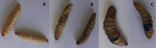 Fig. 3. (A): Healthy GM larva. (B): Larva showing slight and uniform melanisation. (C): Larvae showing localised melanization following injection with a LD100 of C. officinalis ethanolic bark extract. ConclusionThe data presented in this study indicate that the aqueous and ethanolic extracts of barks from C. officinalis as well as the ethanolic extract of seeds from A. indica and G. lucida induced a high toxic effect on GM larvae; while other plant material such as water extract of M. oleifera, C. citratus, and V. amygdalina leaves exerted low toxicity. The high variability of the LD values from one plant to another demonstrates the good sensitivity of GM and allows us to conclude that GM can be used as a reliable system model for the assessment of the toxicity of medicinal plants. However, further studies are needed to establish the exact correlation between LD50, LD90, LD100 values in G. melonella and in vertebrate models in order to facilitate reliable and precise extrapolations in humans. AcknowledgmentsThis study has been supported by the RUDN University Strategic Academic Leadership Program. Conflict of interestThe authors declare that they have no competing interests. ReferencesAbbas, S., Nasreen, S., Haroon, A. and Ashraf, M.A. 2020. Synhesis of silver and copper nanoparticles from plants and application as adsorbents for naphthalene decontamination. Saudi. J. Biol. Sci. 27(4), 1016–1023. Abike, T.O., Osuntokun, O.T., Modupe, A.O., Adenike, A.F. and Atinuke, A.R. 2020. Antimicrobial efficacy, secondary metabolite constituents, ligand docking of Enantia chlorantha on selected multidrug resistance bacteria and fungi. J. Adv. Biol. Biotechnol. 23(6), 17–32. Aderinola, T.A., Alashi, A.M., Nwachukwu, I.D., Fagbemi, T.N., Enujiugha, V.N. and Aluko, R.E. 2020. In vitro digestibility, structural and functional properties of Moringa oleifera seed proteins. Food. Hydrocoll. 101, 105574. Alara, O.R. and Abdurahman, N.H. 2021. Vernonia amygdalina leaf and antioxidant potential. In Toxicology, Eds.,Vinood, B.P. and Victor, R.P. Cambridge, MA: Academic Press, pp: 347–353. Allegra, E., Titball, R.W., Carter, J. and Champion, O.L. 2018. Galleria mellonella larvae allow the discrimination of toxic and non-toxic chemicals. Chem. 198, 469–472. Anwar, F., Latif, S., Ashraf, M. and Gilani, A.H. 2007. Moringa oleifera: a food plant with multiple medicinal uses. Phytother. Res. 21(1), 17–25. Arévalo-Híjar, L., Aguilar-Luis, M.Á., Caballero-García, S., Gonzáles-Soto, N. and Valle-Mendoza, D. 2018. Antibacterial and cytotoxic effects of Moringa oleifera (Moringa) and Azadirachta indica (Neem) methanolic extracts against strains of Enterococcus faecalis. Int. J. Dent. 25, 1071676. Arsene, M.M.J., Viktorovna, P.I., Davares, A.K.L., Esther, N. and Nikolaevich, S.A. 2021. Urinary tract infections: virulence factors, resistance to antibiotics, and management of uropathogenic bacteria with medicinal plants—a review. J. Appl. Pharm. Sci. 11(7), 1–12. Arulselvan, P., Tan, W.S., Gothai, S., Muniandy, K., Fakurazi, S., Esa, N.M., Alarfaj, A.A. and Kumar, S.S. 2016. Anti-inflammatory potential of ethyl acetate fraction of Moringa oleifera in downregulating the NF-κB signaling pathway in lipopolysaccharide-stimulated macrophages. Molecules. 21(11), 1452. Baildya, N., Khan, A.A., Ghosh, N.N., Dutta, T. and Chattopadhyay, A.P. 2021. Screening of potential drug from Azadirachta Indica (Neem) extracts for SARS-CoV-2: an insight from molecular docking and MD-simulation studies. J. Mol. Struct. 1227, 129390. Bharadwaj, K.C., Gupta, T. and Singh, R.M. 2018. Alkaloid group of Cinchona officinalis: structural, synthetic, and medicinal aspects. In Synthesis of medicinal agents from plants, Eds., Ashish, T. and Supriya, T. Amsterdam, Netherlands: Elsevier, pp: 205–227. Braga, T.M., Rocha, L., Chung, T.Y., Oliveira, R.F., Pinho, C., Oliveira, A.I., Morgado, J. and Cruz, A. 2021. Azadirachta indica A. Juss. In vivo toxicity—an updated review. Molecules 26(2), 252. CCOHS (Canadian Centre for Occupational Health and Safety Act). 2021. What is a LD50 and LC50? CCOHS. Retrieved June 02, 2021. Available via https://www.ccohs.ca/oshanswers/chemicals/ld50.html Chinnasamy, G., Chandrasekharan, S., Koh, T.W. and Bhatnagar, S. 2021. Synthesis, characterization, antibacterial and wound healing efficacy of silver nanoparticles from Azadirachta indica. Front. Microbiol. 12, 204. Do, D.N., Nguyen, D.P., Phung, V.D., Le, X.T., Le, T.M., Do, V.M., Minh, B.Q. and Luu, X.C. 2021. Fractionating of lemongrass (Cymbopogon citratus) essential oil by vacuum fractional distillation. Processes 9(4), 593. Dumas, N.G.E., Anderson, N.T.Y., Godswill, N.N., Thiruvengadam, M., Ana-Maria, G., Ramona, P., Crisan, G.C., Laurian, V., Shariati, M.A., Tokhtarov, Z. and Emmanuel, Y. 2021. Secondary metabolite contents and antimicrobial activity of leaf extracts reveal genetic variability of Vernonia amygdalina and Vernonia calvoana morphotypes. Biotechnol. Appl. Biochem. 68(4), 938–947. ECHA (European Chemicals Agency). 2021. ECHA. Retrieved June 1, 2021. Available via https://echa.europa.eu/registration-dossier/-/registered-dossier/10428/7/3/1 Egbuonu, A.C.C. and Amadi, R.P. 2021. Ethanolic extract of ground Vernonia amygdalina stem exhibited potent antibacterial activity and improved hematological bio-functional parameters in normal and monosodium glutamate-intoxicated Rats. J. Appl. Sci. Environ. Manag. 25(3), 311–317. Etame, R.M.E., Mouokeu, R.S., Poundeu, F.S.M., Voukeng, I.K., Cidjeu, C.L.P., Tiabou, A.T., Yaya, A.J.G., Ngane, R.A.N., Kuiate, J.R. and Etoa, F.X. 2019. Effect of fractioning on antibacterial activity of n-butanol fraction from Enantia chlorantha stem bark methanol extract. BMC. Complement. Altern. Med. 19(1), 1–7. Gaponenko, Y., Mialdun, A. and Shevtsova, V. 2020. Diffusion of quinine with ethanol as a co-solvent in supercritical CO2. Molecules 25(22), 5372. Guedje, N.M. and Fankap, R. 2001. Utilisations traditionne