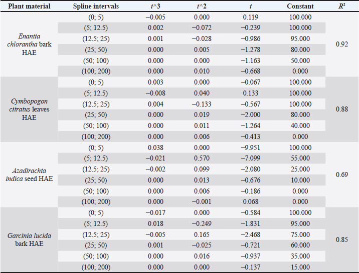It is important to remember that the LD values were obtained using the greater wax moth (GM) as a toxicity assessment model. After 24 hours of incubation, survival data for each concentration of each plant material was used to plot spline cubic survival curves (examples of which are shown in Fig. 2) and to obtain the spline cubic equations (examples of which are presented in Table 2). As expected, no deaths were observed in larvae injected with 20 μl of PBS. However, as shown in Table 3, the LD50 (mg/ml) of the extracts tested varied from 4.87 [90 g/kg body weight (bw)] to >200 (> 166.67 g/kg bw), the LD90 (mg/ml) from 25.00 (18.52 g/kg bw) to >200 (> 181.82 g/kg bw) and LD100 (mg/ml) from 45.00 (40.91 g/kg bw) to > 200 (>181.82 g/kg bw). This difference between the LD values confirmed the good sensitivity of GM, which was reported as changing depending on the substances tested (Megaw et al., 2015; Ignasiak and Maxwell, 2017). The extracts with the highest toxicity were C. officinalis ethanolic bark extract (LD50=3.90 g/kg bw) followed by A. indica ethanolic seed extract (LD50=4.81 g/kg bw) and C. officinalis aquous bark extract (LD50=8.66 g/kg bw). However, other plant material such as water extract of leaves of C. citratus, M. oleifera, and V. amygdalina exerted the lowest toxicity on the greater wax moth with LD50 (mg/ml) of 149.08; 165.40 and > 200 respectively. The high toxicity of both ethanolic and aqueous extract of C. officinalis bark can be attributed to its composition having abundant quinine and its derivatives (dihydroquinine, cinchonidine, epiquinin, quinidine, dihydroquinidine, cinchonine, and epiquinidine) (Júnior et al., 2012; Bharadwaj et al., 2018) which are slightly soluble in water and soluble in ethanol (Gaponenko et al., 2020). Indeed, Quinine, C20H24N2O2, (8S, 9R) -6′-methoxycinchonana-9ol;(αR)-α-(6-methoxy-4-quinoyl)-α-[(2S, 4S, 5R)-(5-vinylquinuclidin-20yl)] methanol, is the most important alkaloid occurring in Cinchona (Maurice, 2014). We did not find any study in the literature evaluating the toxicity of extracts of C. officinalis but quinine was reported to have an LD50 of 1.392, 0.660 and 0.641 g/kg bw when administered orally to rats, mice, and rabbits, respectively (ECHA, 2021). These values differed to ours probably because the results reported by ECHA (2021) were those of pure quinine while our study focused on extracts with heterogeneous composition. Furthermore, and interestingly, we observed that some larvae exposed to concentrations greater than the LD100 of ethanolic extracts of C. officinalis bark exhibited localized melanization, whereas larvae injected by lower concentrations had slight and uniform melanization (Fig. 3). These results are similar to those obtained by Megaw et al. (2015) who used the GM model to test the toxicity of 1-alkyl-3-methylimidazolium chloride ionic liquids. Megaw et al. (2015) reported that melanization is a common component of the insect immune response, which occurs as a result of stress or infection, and leads to the larvae changing from cream-colored to dark brown or black. The two types of melanization in our study (Fig. 3B and C) can be explained by the fact that the high concentrations of the extracts were poorly distributed within the larvae unlike the low concentrations. Table 2. Cubic spline model used to determine the LD50, LD90 and LD100 of E. chlorantha bark ethanolic extract (HAE), C. citratus leaves HAE, A. indica seed HAE and G. lucida bark HAE.