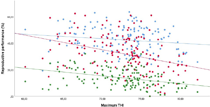 Fig. 2. Scatter plots between service rate (blue color), conception rate (red color), pregnancy rate (green color), and the maximum temperature–humidity index. Lines represent the fitted estimated regression following the maximum temperature–humidity index (SR=65.037 – 0.309 * max THI; CR=158.576 – 1.740 * max THI; and PR=74.519 – 0.835 * max THI). SR: service rate; CR: conception rate; and PR: pregnancy rate. However, other studies have reported that the effect of heat stress was expressed mainly in the reduction of the estrous duration and intensity (Badinga et al., 1985; Nebel et al., 1997; Roth and Wolfenson, 2016). In Florida, USA, a study found out that the percentage of silent heats during the summer months (June–September) was from 76% to 82%, while in the winter months (October–May) this percentage dropped between 44% and 65% (Thatcher and Collier, 1986). It has been contemplated that the main reason why the estrous expression is reduced in summer is due to the animals’ lack of physical activity, trying to reduce the heat production while lowering the overall heat detection by the observer (Boni et al., 2014). This agrees with a previous report that cows under chronic heat stress conditions remain in the stationary position most of the time, with the intention to dissipate heat (Allen et al., 2015). Likewise, early postpartum heat stress increases the risk of negative energy balance by lowering body condition scores, decreasing the dominant follicular diameter and the follicular fluid, and producing lower quality oocytes and ovarian granulosa cells, which ultimately results in lower fertility (Shehab-El-Deen et al., 2010) and in the increment of open days (Boni et al., 2014). It has been identified that heat stress during oocyte maturation and ovulation results in a deleterious effect on embryonic development (Ealy et al., 1993; Putney et al., 1989; Silva et al., 2013). After ovulation, heat stress affects the luteal progesterone production, which modifies the oviduct and uterus microenvironment compromising embryo survival (Howell et al., 1994). Furthermore, it has been found that heat stress affects bovine embryo development by decreasing the development rates, raising the apoptotic blastomeres percentages, and lowering the expression of important genes for embryonic survival (Silva et al., 2013). Also, heat stress negatively affects oocyte quality (López-Gatius and Hunter, 2017), maturation, fertilization (Roth and Wolfenson, 2016), embryonic development (Silva et al., 2013), and its survival (Roth and Wolfenson, 2016). Altogether, it lowers the chances of impregnating the served cows. This is the reason why Lima’s dairy farms pregnancy rates are so heavily affected during the summer months where max THI reached mean values above 75 units. It was concluded that the increase in max THI significantly affects the cows’ reproductive performance in dairy farms located in Lima. With every increased unit of max THI, monthly conception and pregnancy rate decreased by 1.74% and 0.84%, respectively. AcknowledgmentThe authors would like to thank the Servicio Nacional de Meteorología e Hidrografía de Perú (SENAMHI) for providing meteorological data; as well as the farm owners and personnel for kindly facilitating the necessary information needed to perform the present study. Conflict of interestThe authors declare that there is no conflict of interest. Authors’ contributionsAll authors conceived the study, wrote the paper, and participated in monitoring the results. All authors read and approved the final manuscript. ReferencesAllen, J.D., Anderson, S.D., Collier, R.J. and Smith, J.F. 2013. Managing heat stress and its impact on cow behavior. In: Proceedings of Western Dairy Management Conference, Reno, NV, pp: 150–162. Allen, J.D., Hall, L.W., Collier, R.J. and Smith, J.F. 2015. Effect of core body temperature, time of day, and climate conditions on behavioral patterns of lactating dairy cows experiencing mild to moderate heat stress. J. Dairy Sci. 98, 118–127. Amundson, J.L., Mader, T.L., Rasby, R.J. and Hu, Q.S. 2006. Environmental effects on pregnancy rate in beef cattle. J. Anim. Sci. 84, 3415–3420. Badinga, L., Collier, R.J., Thatcher, W.W. and Wilcox, C.J. 1985. Effects of climatic and management factors on conception rate of dairy cattle in subtropical environment. J. Dairy Sci. 68, 78–85. Boni, R., Perrone, L.L. and Cecchini, S. 2014. Heat stress affects reproductive performance of high producing dairy cows bred in an area of southern Apennines. Livest. Sci. 160, 172–177. Brett, J.A. and Meiring, R.W. 2014. Evaluating reproductive performance on dairy farms. In Bovine reproduction, Ed., Hopper, R.M. Ames, IA: John Wiley Sons, Inc, pp: 370-373. Dash, S., Chakravarty, A.K., Singh, A., Upadhyay, A., Singh, M. and Yousuf, S. 2016. Effect of heat stress on reproductive performances of dairy cattle and buffaloes: A review. Vet. World 9, 235–244. De Rensis, F., Garcia-Ispierto, I. and López-Gatius, F. 2015. Seasonal heat stress: Clinical implications and hormone treatments for the fertility of dairy cows. Theriogenology 84, 659–666. Ealy, A.D., Drost, M. and Hansen, P.J. 1993. Developmental Changes in Embryonic Resistance to Adverse Effects of Maternal Heat Stress in Cows. J. Dairy Sci. 76, 2899–2905. Ferguson, J.D. and Galligan, D.T. 2000. Assessment of reproductive efficiency in dairy herds. Compend. Contin. Educ. Pract. Vet. 22, 150–159. Fetrow, J., McClary, D., Harman, R., Butcher, K., Weaver, L., Studer, E., Ehrlich, J., Etherington, W. Guterbock, W., Klingborg, D., Reneau, J. and Williamson, N. 1990. Calculating selected reproductive indices: recommendations of the American Association of Bovine Practitioners. J. Dairy Sci. 73, 78–90. Fetrow, J., Stewart, S., Eicker, S. and Rapnicki, P. 2007. Reproductive health programs of dairy herds: analysis of records for assessment of reproductive performance. In Current therapy in large animal