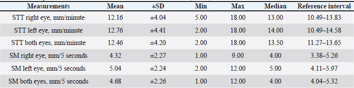 AbstractBackground: The surface of the eye is covered by the preocular tear film, which is critical for maintaining a normal, healthy, visual, and comfortable vision. The Schirmer tear test (STT) and, more recently, strip meniscometry (SM) are used to evaluate tear production. Aim: To establish the normal values for STT and SM in healthy cats and to discover the correlation between these tests. Methods: A total of 25 mixed breed cats, aging from 8 months to 13 years of both genders (10 females and 15 males) were included in the study. All the cats were assigned to the study as being both clinically and ophthalmologically healthy. For the SM test, the tip of the strip was used to evaluate the meniscus without touching the eyelid or the cornea for 5 seconds. After a full tear washout period of 10 minutes, the STT was performed using a standard STT strip. Results: In the right eyes, the mean ± standard deviation (SD) of SM was 4.32 ± 2.27 mm/5 seconds, and in the left eyes it was 5.04 ± 2.24 mm/5 seconds (for both eyes combined: 4.68 ± 2.26 mm/5 seconds), with a median of 4 in both eyes; the reference values ranged from 4.04 to 5.32 mm/5 seconds. No significant differences were recorded in the SM between the right and left eyes of the cats when using the SM (p > 0.05). When the STT was used, the mean ± SD for the cats’ right eyes was 12.16 ± 4.04 mm/minute, and for the left eyes, it was 12.76 ± 4.1 mm/minute (for both eyes combined: 12.46 ± 4.20 mm/minute), with a median of 13.50 for both eyes. Reference values were calculated and ranged from 11.27 to 13.65 mm/minute. No significant differences were recorded between the STT for the right and left eyes (p > 0.05). Conclusion: Both tests can, therefore, be used to assess tear production in cats. For more precise results, SM should be evaluated according to the cat’s eye position—whether it is a brachiocephalic cat or a normaloid cat—and according to the age. In all cases, STT and SM should be evaluated according to the animal’s clinical status and the results of other diagnostic tools. Keywords: Cat, STT-1, Meniscometry, Tears. IntroductionThe eye’s surface is covered by the precorneal tear film, which is critical for maintaining a normal, healthy, visual, and comfortable eye (Dilly, 1994; Ohashi et al., 2006). The aqueous portion, the middle layer of the tear film, plays an essential role in providing the necessary ocular surface moisture, a normal nutrient supply, and the oxygenation needed to maintain a smooth and transparent cornea (Grahn and Storey, 2004). If the tear film is lost, the eye loses its protective ability, which may lead to ocular infection, corneal abrasion, and erosion, or even a corneal ulcer and keratitis, which can lead to keratoconjunctivitis sicca. The Schirmer tear test (STT) provides a vital measurement in all animals as part of an initial ophthalmic examination. For years, the use of the STT with cats was controversial, with low STT values being interpreted as indicative of cat stress (Lim et al., 2009). In a clinical setting, the STT is the primary quantitative tear test. More recently, the strip meniscometry (SM) test, which was initially used in human medicine, has also been used in animals (Dogru et al., 2006; Miyasaka et al., 2019). However, limited data are available on the normal values for SM and the correlation between STT and SM although some positive correlations have been found in both humans and dogs (Dogru et al., 2006; Kazama et al., 2014; Miyasaka et al., 2019). The STT is the conventional test, and it requires the placement of a paper strip in the ventral conjunctival fornix for one minute. In contrast, SM is performed by placing the tip of a strip in the meniscus for just 5 seconds. This study aimed to establish the normal values for STT and SM in healthy cats and to discover the correlation between the results of these tests. Materials and MethodsThe study was performed with full respect for ethical criteria and the welfare of the cats involved. All the animals examined were privately owned and were outpatients at the Latvia University of Life Sciences and Technologies (LLU) veterinary clinic. Twenty five mixed breeds cats, aged from 8 months to 13 years of both genders (10 females and 15 males) were included. To ensure uniformity in the results, the ophthalmological examination of all animals was conducted by the same person, the veterinarian/ophthalmologist of the Clinical Institute of the Faculty of Veterinary Medicine at the LLU. The ophthalmic examination included direct ophthalmoscopy (Keeler Practitioner, Windsor, UK), monocular ophthalmoscopy with the PanOptic ophthalmoscope (Welch Alynn, Romford, UK), slit-lamp biomicroscopy (Kowa SL15, Nagoya, Aichi, Japan), and rebound tonometry (TonoVet®, Tiolat Ltd., Finland). All cats were assessed as being both clinically and ophthalmologically healthy.