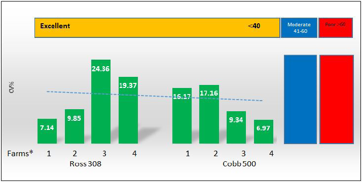 Fig. 1. Coefficient correlation (CV %) of 1-day-old Ross 308 and Cobb 500 broiler chicks. (*) Farms: (1): Tel-Afar; (2): Kokjaly; (3): Al-Hamadaniya; (4): Al-Quba.