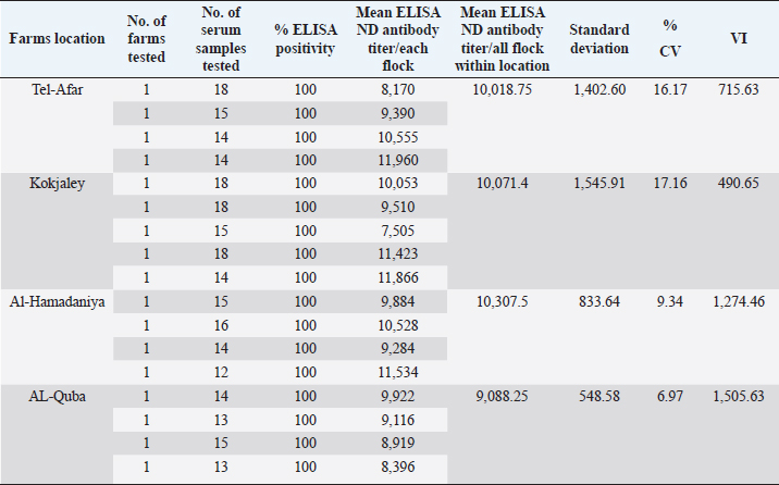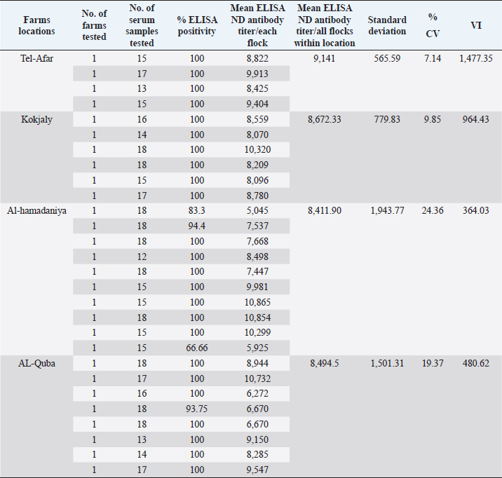 Table 2. Serum samples from 1-day-old Cobb broiler (locations and farms), in Nineveh governorate tested and their mean ELISA ND maternal antibody titer.