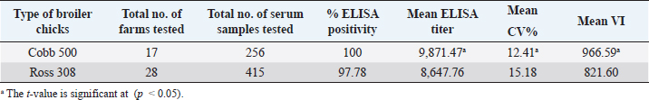 Table 3. Summary of the total number of imported 1-day-old Ross 308 and local Cobb 500 broiler chicks, serum samples, mean ELISA titers, mean CV percentage (CV%), and mean VI.