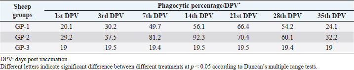 DiscussionThe results of cellular immunity were coming as stated by Knudsen et al. (1979), who reported that cell-mediated immune response was a constitute of immune response against FMDV, and Garcia et al. (1996), Elwatany et al. (1999), Sonia et al. (2010), and Fakhry et al. (2012) mentioned that the delta optical density of lymphocyte blastogenesis assay and IL-6 at 0, 3, 7, 14, 21, and 28 -DPV showed that a significant difference between vaccinated and control groups started at 3rd DPV and increased gradually till 21st DPV using trivalent FMD Montanide inactivated vaccine. Also, our result come in parallel to El-Din et al. (2014) who concluded that the Egyptian trivalent FMD oil vaccine showed a maximum cellular immune response at 21 DPV. The results of humoral immunity came in parallel with the result obtained by Ibrahim et al. (2015) who indicated that vaccines emulsified using Montanide ISA 201 adjuvant elicited a protective humoral immune response from the 2nd WPV for ISA 201 oil by SNT and ELISA titers of (1.62 ± 0.047a and 1.8 ± 0.049a); (1.59 ± 0.076a and 1.836 ± 0.077a) and (1.71 ± 0.06b and 1.96 ± 0.074b) by SNT and ELISA for serotypes O, A, SAT2, respectively, and ISA 206 showed antibody titer by SNT and ELISA of (1.5 ± 0.082a and 1.84 ± 0.084a); (1.56 ± 0.037a and 1.818 ± 0.052a) and (1.5 ± 0.106a,b and 1.81 ± 0.104a,b) for FMDV serotypes O, A, and SAT2, respectively. Our results also were consistent with the statement of Hamblin et al. (1986), who explained that the SNT measures those antibodies which neutralize the infectivity of FMD virion, while ELISA probably measure all classes of antibodies even those produced against incomplete and non-infectious virus. In addition, these results agree with those obtained by Selim et al. (2010) who reported that the mean antibody titers against FMD vaccine strain O1/3/93 were detected in sheep sera vaccinated with Alumhydroxide gel vaccine following one WPV by SNT, whereas, the mean peak titers (1.9 log10) by SNT were detected by the 6th week post-vaccination. Our results also agreed with Mohamed et al. (2013) who used FMD ISA 206 oil bivalent vaccine alone and noticed that the specific FMD neutralizing antibody titer reached a protective level starting from the 4th WPV to record peak titer by the 16th WPV and then declined gradually afterward. El-Sayed et al. (2012) reported that vaccination of calves with the locally produced bivalent FMD adjuvant vaccine induced higher antibody titer than the recommended protective level (1.5 log10 for SNT and 1.8 log10 for ELISA) for type A and O estimated by SNT and ELISA. This antibody titer remained within the protective level up to 34 WPV. El-Din et al. (2014) concluded that the Egyptian trivalent FMD oil vaccine-induced protective humoral immune response extended for 32 WPV. The obtained high levels of FMD immune response in vaccinate sheep receiving BV could be attributed to effect of BV as immunomodulator which stimulates immune system to protect the body against infection by its stimulation of prostaglandin generation which have biological activities resulting in stimulation of IL-10, TNF alpha, and CD8 which result in regulation in IgE which responsible for histamine release (Rekka et al., 1990). Eiaka et al. (2016) found that following up rabies antibodies in vaccinated dogs using SNT revealed that BV induced the highest levels of antibodies (128) when inoculated before and simultaneously with vaccination by rabies vaccine. Rabies vaccine alone or before inoculation of BV induced lower titers of antibodies (32 and 64, respectively) by the fourth week post-vaccination. Also, ELISA confirming came parallel to those of SNT revealing that BV induced the highest levels of antibodies (7 and 6 log2, respectively) when inoculated before and simultaneously with vaccination by rabies vaccine and rabies vaccine alone or before inoculation of BV induced lower ELISA titers (5 log2) by the fourth week post-vaccination. Depending on the demonstrated data it could be concluded that BV enhances the immune response of vaccinated sheep to the trivalent FMD vaccine resulted in earlier induction of specific FMD serotypes antibodies than in the case of administration of the vaccine alone reaching their peak on earlier time with prolonged duration of immunity. ReferencesAntley, P.P. and Hazen, K.C. 1988. Role of yeast cell growth temperature on Candida albicans virulence in mice. Infect. Immun. 56(11), 2884–2890. Carr, B.V., Lefevre, E.A., Windsor, M.A., Inghese, C., Gubbins, S., Prentice, H., Juleff, N.D. and Charleston, B. 2013. CD4+ T-cell responses to foot-and-mouth disease virus in vaccinated cattle. J. Gen. Virol. 94(Pt 1), 97–107. Depa, P.M., Dimri, U., Sharma, M.C. and Tiwari, R. 2012. Update on epidemiology and control of foot and mouth disease—a menace to international trade and global animal enterprise. Vet. World 5(11), 694–704. Eiaka, A.M., El-Bagoury, G.F., El-Nahas, E.M. and Khodeir, M.H. 2016. Investigation of the effect of bee venom on the immune response of dogs to rabies vaccine. BVMJ 31(2), 254–257. El-Din, W.M.G., EES, I.H. and Ali, S.M. 2014. Humeral and cellular immune response of Egyptian trivalent foot and mouth disease oil vaccine in sheep. Res. Opin. Anim. Vet. Sci. 4(4), 178–185. El-Mayet, F.S., Sharawi, S.S.A., EL-Habbaa, A.S., Shahen, N.M. and Hagaa, N.M. 2020. Rapid detection and isolation of foot and mouth disease virus in samples from clinically suspected animals in Egypt during 2016–2019. BVMJ 39, 135–140. EL-Naggar, H. 2012. Preparation of inactivated lyophilized NDV vaccine. M.V.Sc. in Veterinary Science (Virology) Thesis, Cairo University, Cairo, Egypt. El-Sayed, E., Gamal El-Din, W.M., Rizk, S.A. and Abd El-Aty, M. 2012. Effect of different storage temperatures on the efficacy of the bivalent foot and mouth disease oil vaccine. J. Adv. Vet. Res. 2, 198–205. Elwatany, H., Shawky, M., Rhshdy, O.H. and El-Kelany, S. 1999. Relationship between 