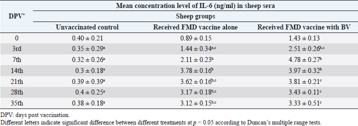 Table 4. Mean concentration of IL-6 (ng/ml) in vaccinated sheep.