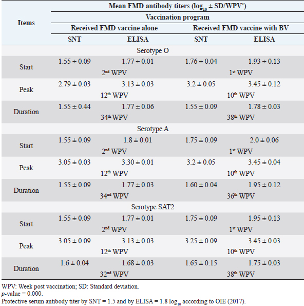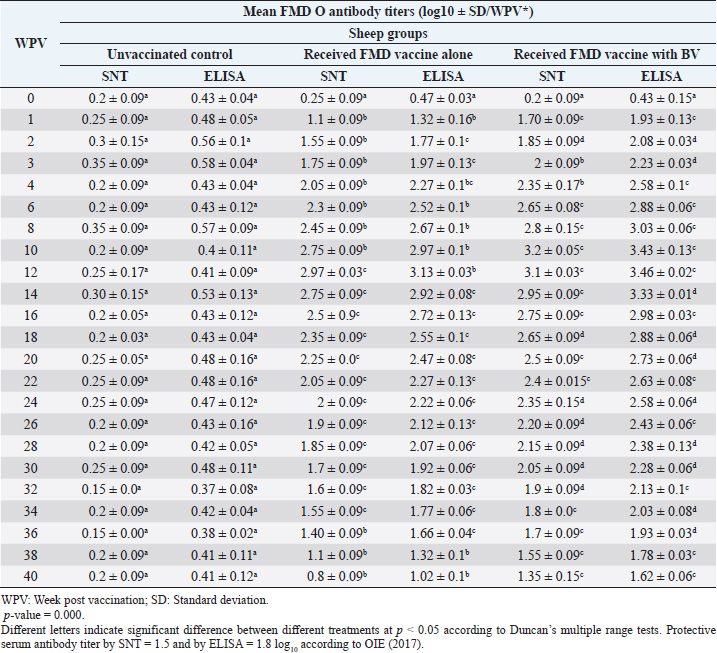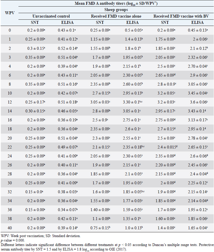 Monitoring of sheep immune response to FMD vaccine alone or with BV through application of SNT and solid phase indirect ELISA; revealed that vaccinated sheep exhibited FMD serotype O protective antibody titers (1.55 ± 0.09 and 1.77 ± 0.1 log10 by SNT and ELISA, respectively, by the second week post-vaccination with FMD vaccine alone. These values were higher with administration of BV (1.70 ± 0.09 and 1.93 ± 0.13 log10 by SNT and ELISA, respectively) by the first week post-vaccination. These titers recorded their peaks (2.97 ± 0.03 log10 by SNT and 3.13 ± 0.03 log10 by ELISA) on the 12th WPV and 3.2 ± 0.05 log10 by SNT and 3.43 ± 0.03 log10 by ELISA on the 10th WPV using the vaccine alone and with BV, respectively. FMD antibodies were gradually decreased to reach its lowest protective levels (1.55 ± 0.9 log10 by SNT and 1.77 ± 0.06 log10 by ELISA) on the 34th WPV with FMD vaccine alone while in the case of administration of BV these values were (1.55 ± 0.09 log10 by SNT and 1.78 ± 0.03 log10 by ELISA) on the 38th WPV. Non-protective FMD serotype O antibody titers (less than 1.5 and 1.8 log10 by SNT and ELISA, respectively) were recorded by the 36th and 40th WPV with FMD vaccine alone and with BV, respectively. These results are demonstrated in Table 6. Table 6. Mean FMD serotype O serum neutralizing antibody and ELISA titers in vaccinated sheep.