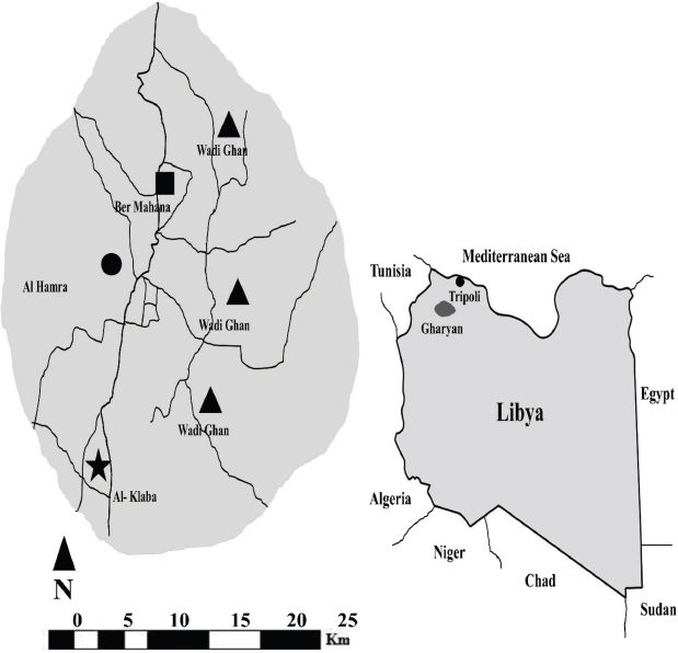 AbstractBackground: Fleas play a major role as vectors for many pathogens that affect humans and livestock. Wild animals, especially wild rodents, are the most important hosts, acting as reservoir hosts for many flea species and pathogens. Aim: This study aimed to identify seasonality and hosts of fleas that parasitize small wild mammals in Gharyan, north-western Libya. Methods: Fleas were collected from seasonally infested hosts from summer 2017 to winter 2018. Results: This survey identified three flea species: Pulex irritans, Xenopsylla cheopis, and Leptopsylla segnis. Pulex irritans was collected from porcupines, X. cheopis from hedgehogs and jerboas, whereas L. segnis from gundis. The highest flea prevalence was in porcupines (35.00%) and the lowest was in gundis (11.11%). The highest intensity was in porcupines (10.43 ± 4.37), and the lowest was in jerboas (1.28 ± 0.24). The highest mean flea abundance was among porcupines of 3.65, whereas in hedgehogs, jerboas and gundis were less than 0.50 flea/host. Pulex irritans was collected during all seasons, while X. cheopis was collected during all seasons except winter, whereas L. segnis was collected only in spring. Conclusion: The finding in this study has increased our awareness that small wild mammals can act as hosts for medically important flea species. All collected flea species have a great specialty in choosing their hosts. Flea intensity is affected by seasonal variations. Keywords: Fleas, Gharyan, Libya, Siphonaptera, Wild mammals. IntroductionMammals, especially rodents, are considered as reservoirs of several pathogens; protozoa, helminths, bacteria, and viruses (Horta et al., 2007); they are infested with ectoparasites which can transmit pathogens (Azad et al., 1997; Perry and Fetherston, 1997; Morick et al., 2011; Iannino et al., 2017). Their ability to adapt to live in urban and rural settings has increased their ability to transmit pathogens to domestic animals and humans (Oliveira et al., 2010). Fleas (Siphonaptera) are highly specialized insects. About 2,575 flea species have been described, and they belong to 16 families and 238 genera (Bitam et al., 2010). Some species are restricted or specialized to certain hosts, while others have a wide host range (Maleki-Ravasan et al., 2017). Over the past decades, dramatic changes have occurred in the geographic distribution and ranges of hosts of vector-borne pathogens; this process is often driven by climate changes and deforestation (Walsh et al., 1993; Gottwalt, 2013). In the last 30 years, deforestation has occurred in Libya, leading to the immigration of wild animals from their environments to areas inhabited by humans. Those animals can carry many fleas and pathogens; therefore, fleas can be transmitted to human dwellings (Hosni and Maghrbi, 2014). Studies of flea diversity, distribution, seasonality, and associated hosts are important for preventing and controlling outbreaks of potential flea-borne pathogens (e.g., plague). Hence, having a good taxonomical knowledge of potential fleas, associated hosts, and seasonality is crucial. There are no comprehensive studies in Libya on flea diversity, seasonality, and their hosts, especially in the Jabal Nafusa region. This study aimed to identify the seasonality and hosts of fleas that parasitize small wild mammals in Gharyan in the north-western part of Libya. Materials and MethodsStudy areaThis survey was carried out from summer 2017 to winter 2018 in Gharyan, which is located on Jabal Nafusa (32.1718° N, 13.0184° E), in the north-western region of Libya (Fig. 1). A great diversity characterizes this region in terms of relief (mountains, hills, and valleys). It is also characterized by seasonal herbs, annuals, and medium-sized plants, such as olive and fig trees. The climate is between the Mediterranean climate and the desert climate. According to Gharyan meteorological station (2017), the mean monthly rainfall is 49 mm, the mean monthly relative humidity is between 15% and 83%, and the temperature ranges from 4ºC to 43ºC. Animal capture and flea collectionSamples of wild mammals were collected seasonally in Gharyan during the study period. Porcupines (Hystrix cristata) and gundis (Ctenodactylus gundi) were captured using 16 live traps baited with bread and a few vegetables. Traps were set in shadow and checked every other day in the early morning, whereas jerboas (Allactaga elater) were caught at night using a net. They were anesthetized with Calmivet® I.M, 3 ml for animals weighing approximately 5 to 7 kg and 1.5 ml for animals weighing less than 5 kg. Hedgehogs (Atelerix algirus) were caught by hand without anesthetization. After collecting fleas, the animals were released into their natural habitat. All fleas were collected from all infested hosts. In the case of hosts whose bodies were covered with hair and lint, fleas were collected using a metal comb (11 teeth per cm), whereas hosts whose bodies were covered with spines, fleas were collected from them by tweezers. Collected fleas were preserved in vials containing 70% ethanol. The samples were taken to the Laboratory of Entomology in Zoology Department, Faculty of Science, University of Tripoli, to mount and identify species levels by using an identification key (Smit, 1957).