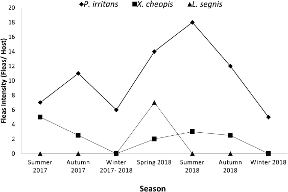 Fig. 2. Seasonal intensity of fleas that were collected in all seasons from Gharyan. Ethical approvalAnimal capture was carried out in compliance with the animal welfare guidelines (Ryan et al., 2019). ResultsOne hundred and six flea specimens were collected from 26 wild hosts; 10 hedgehogs, 7 porcupines, 7 jerboas, and 2 gundis (Table 1). About 69% of fleas were collected from porcupines, whereas hedgehogs, jerboas, and gundis were represented less than 20.00% each. Three species of fleas were identified; Pulex irritans which were collected only from porcupines, Xenopsylla cheopis collected from hedgehogs and jerboas, and Leptopsylla segnis was collected only from gundis. The highest FP was estimated in porcupines (35.00%), followed by jerboas (25.00%), whereas hedgehogs and gundis represented less than 25.00% each. Kruskal-Wallis H test revealed no significant difference in the prevalence of fleas among hosts (H=3, df=3, p=0.39). The highest intensity was in porcupines (10.43 ± 4.37), and the lowest was in gundis (1.28 ± 1.22). There was no significant difference in FI among hosts (Kruskal-Wallis H test, H=3.00, df=3, p=0.29). The highest MFA was in porcupines 3.65, whereas in hedgehogs, jerboas and gundis were less than 0.40. There was no significant difference in flea abundance among hosts (Kruskal-Wallis H test, H=3.00, df=3, p=0.20). SeasonalityPulex irritans was collected in all seasons, while X. cheopis was collected in all seasons except winter, whereas L. segnis was only collected in spring (Fig. 2). The highest values of fleas’ indicators in all hosts were in summer and autumn, followed by spring, and the lowest in winter (Table 2). DiscussionIn recent years, most studies in Libya regarding medical and veterinary entomology have focused on ticks and mosquitoes, and they have not focused much on fleas. This is the first study investigating flea fauna, which parasitizes wild hosts in Gharyan, Libya. During the last 30 years, deforestation due to human activity has been observed in Libya, which has led to the immigration of wild animals from their natural habitat to areas inhabited by humans and domestic animals. As a result, small wild mammals have become synanthropic species in new habitats (Hosni and Maghrbi, 2014). Only 113 wild hosts were captured; it is not easy to capture such hosts, as they inhabit rugged mountainous environments and are only present at night. In addition to the difficulty of dealing with them, there are strong and sharp thorns on their bodies. Three species of fleas were identified in this study; P. irritans, X. cheopis, and L. segnis. These species were among the fifteen species previously recorded in Libya (Zavattari, 1934; Misonne, 1977; Kaal et al., 2006; Mohamed and Shaurub, 2010; Elsaid et al., 2013; Hosni and Maghrbi, 2014). It is recommended to conduct more studies in Libya to have a clearer picture of fleas in different habitats. Pulex irritans has a cosmopolitan distribution (Bitam et al., 2010). It has less host specificity, it was found in Libya infesting dogs, goats, and sheep (Kaal et al., 2006; Elsaid et al., 2013) and in other regions (Zavattari, 1934; Gracia et al., 2000; Christodoulopoulos et al., 2006). As early as the 14th century, P. irritans was recognized as a bubonic plague vector (Ratovonjato et al., 2014). Pulex irritans also has been identified as a vector for Bartonella and Rickettsia (O’Donnell and Elston, 2020). Xenopsylla cheopis was found in north-western Libya: on rodents (Kaal et al., 2006), on common jackals (Canis aureus) (Hosni, 2006), and free-ranging hedgehogs (Etelerix algirus) (Hosni and Maghrbi, 2014); is also collected in other sites in the country (Zavattari, 1934). It is the best-known vector of the causative agents of plague (Yersinia pestis) and murine typhus (Rickettsia typhi) (Wells and Elston, 2020). Leptopsylla segnis was collected in Libya, in Benghazi (Zavattari, 1934). It has a high host specificity; it infests only rodents (Smart, 1956; Loftis et al., 2006; Maleki-Ravasan et al., 2017). It has a wide distribution, especially in temperate regions (Gratz, 1999). Leptopsylla segnis can transmit plague and rickettsiosis (Darvishi et al., 2014). Rickettsia typhi was detected in L. segnis in Cyprus (Christou et al., 2010). Libya was affected by the appearance of plague foci over intermittent periods in different areas. The last foci were in Tobruk city near the Egyptian border in 2009, followed by 2011 (Tarantola et al., 2009). The collected species are vectors of plague. In the future, it will be necessary to investigate flea-transmitted pathogens both for fleas and their hosts. AcknowledgmentsWe would like to express our deepest appreciation to friends and colleagues who helped us in sample collection. Conflict of interestsThe authors declare that there is no conflict of interest. FundingThis work was funded by the University of Tripoli. Authors’ contributionsTS and SG involved in conception, design, and organization of the study; TS, SG, and WYMB contributed to the conduct of the study; WYMB was responsible for acquisition of data; TS, SG, and WYMB helped in analysis and interpretation of data, TS, SG, and WYMB contributed to drafting of the manuscript and critiquing the output for important intellectual content. All authors discussed the results and commented on the manuscript. ReferencesAzad, A.F., Radulovic, S., Higgins, J.A., Noden, B. and Troyer, J.M. 1997. Flea-borne rickettsioses: ecologic considerations. Emerg. Infect. Dis. 3, 319–327. Bitam, I., Dittmar, K., Parola, P., Whiting, M.F. and Raoult, D. 2010. Fleas and flea-borne diseases. Mem. Inst. Oswaldo Cruz 14, e667–e676. Christodoulopoulos, G., Theodoropoulos, G., Kominakis, A. and Theis, J.H. 2006. Biological, seasonal and environmental factors associated with Pulex irritans infestation of dairy goats in Greece. Vet. Parasitol. 137, 137–143. Christou, C., Psaroulaki, A., Antoniou, M., Toumazos, P., Ioannou, I., Mazeris, A., Cho