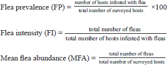 Statistical analysisThe data were classified according to flea species, host species, sampling seasons, and area. Fleas per host, season, and area were calculated according to International Definitions Indicators (Yin et al., 2011):