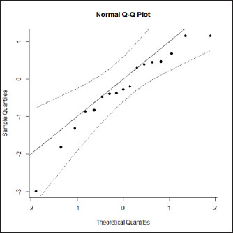 Fig. 3. Normal Q-Q plot of the adjusted model. Within the factor “vaccination timing” the levels “before calving” and “after calving” were considered. This factor was included with significance (p < 0.001) in the main model. The vaccination before calving shows some vaccine efficacy, with the CI slightly intercepting logRR=1, while the opposite is observed with vaccination after calving, where clearly there is lack of vaccine efficacy. Please note that for the subgroup “after calving” we have included Bradley et al. (2015-2), not included in the main model for the reasons explained before. Anyway, while not considering this study the result is similar. The difference being the 95% CI interception of logRR=1.