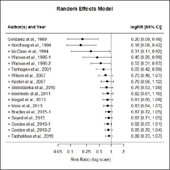 Fig. 1. Forest plot of the adjusted model. Publication bias, normal distribution of residuals, and sensitivity analysisThe regression test applied to the adjusted model shows non-significant publication bias (Z=0.316, p=0.75), which is confirmed by the graphical analysis of the funnel plot (Fig. 2). The model also shows to be smooth, with the simulated pseudo residuals falling within the pseudo confidence envelop of the normal Q-Q plot shown on Fig. 3. Analysis of the covariate “year of publication”The vaccination efficacy reported by the trials used in this meta-analysis has been decreasing over time. The meta-regression performed to the covariate “year of publication” illustrates this fact (Fig. 4). This can also be illustrated by the cumulative meta-analysis (Fig. 5) performed, using a random effects model. As we add new trials over time, the vaccine efficacy decreases. Despite overall values of the logRR below one, and therefore favoring the vaccine efficacy, we can also observe that shorter CIs, due to the increase of the sample size, still include the value “one” where the limit for lack of vaccine efficacy seats. Analysis of the factors used as moderatorsTable 3 summarizes the results of the application of random effects models to the different levels of the factor moderators used in this study. Within the factor “vaccine fabrication” the levels “self-fabrication” and “commercial vaccine” were considered. This factor was included with significance (p < 0.001) in the main model. The “self-fabrication” subgroup has shown some vaccination efficacy, which is not the case with “commercial vaccine.”