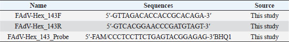 AbstractBackground: Fowl adenovirus (FAdV) 8b and other serotypes cause inclusion body hepatitis (IBH) in chickens. Specific detection of aetiologic serotype in mixed infection and vaccine failure could be difficult. Aim: The objective of this study was to develop a TaqMan probe-based qPCR method for the detection and quantification of the FAdV 8b challenge virus. Methods: Forty-eight broiler chickens inoculated with live attenuated or inactivated FAdV 8b strains at day 1 of age either with or without booster at day 14 post-inoculation were used. The chickens were challenged with a pathogenic strain of FAdV 8b at day 28 of age. Liver and cloacal swabs were collected on days 7 and 14 post-challenge. Primers and probes were designed, specificity confirmed, and used to carry out qPCR amplification. Results: The assay amplified the FAdV DNA challenge virus, but not that of the live attenuated virus. It could detect FAdV 8b DNA as low as 0.001 ng/µl in liver and cloacal swab samples. Copy numbers obtained indicate virus load and shedding. Conclusions: It shows that a selective detection of FAdV 8b within serotype is possible. It can be useful for rapid detection and diagnosis of the disease, virus quantification and differentiation within species, determination of vaccination failure, and efficacy especially the virus load in the target organ and shedding. Keywords: Fowl adenovirus 8b, Real-time PCR, TaqMan probe, Virus detection, Virus quantification. IntroductionFowl adenoviruses (FAdVs) which belong to the family Adenoviridae and genus Aviadenovirus have been reported to be ubiquitous in avian species including chickens. The five species of FAdV (FAdV-A–FAdV-E) have been classified into 12 serotypes (1–7, 8a, 8b, 9–11) (Hess, 2000; Günes et al., 2012; Gupta et al., 2017). FAdV serotype 8b is the aetiologic agent of inclusion body hepatitis (IBH) reported worldwide such as USA (Mendelson et al., 1995), India (Mittal et al., 2014), Canada (Ojkic et al., 2008), Hungary (Kajan et al., 2013), Korea (Choi et al., 2012), Japan (Mase et al., 2009), China (Li et al., 2010), and Malaysia (Hair-Bejo, 2005; Norina et al., 2016). But serotypes 2, 7, 8a, and 11 are also known to cause the disease (Gomis et al., 2006; Philippe et al., 2007; Ojkic et al., 2008; Steer et al., 2011; Choi et al., 2012). IBH is an emerging disease of chickens associated with increasing flock mortality rate usually ranging from 10% to 30% but could be as low as 2% (Choi et al., 2012; Dar et al., 2012). The disease is characterized by sudden onset of mortality which peaks at 3–4 days of infection and ends on the fifth day but can continue up to 2–3 weeks. Sick chickens appear with ruffled feathers and die within 48 hours or may recover (Calnek et al., 1991). It affects broiler chickens usually at 3–7 weeks of age and affects other avian species like turkeys, geese, pheasants, and quails (Cowen, 1992). The disease has also been reported within a week after hatching in broilers (Asthana et al., 2013) as well as in pullets (Choi et al., 2012). Transmission is vertical through embryonated eggs or horizontal through direct contact with excreta of infected chicken or fomites (Pilkington et al., 1997). Horizontal transmission through the oral-fecal route is an attribute of this disease which makes virus shedding through the cloaca an important factor. Due to the sudden mortality associated with this disease, it is pertinent to develop rapid detection and diagnostic methods for use during outbreaks to aid prompt intervention, effective control, and possible eradication. Isolation of FAdV either through the chicken embryonated egg (CEE) or cell culture followed by electron microscopy analysis had been reported (Hair-Bejo, 2005) but they are less sensitive, laborious, and time-consuming requiring in some cases weeks for obtaining the results (McFerran and Smyth, 2000). More recently, conventional polymerase chain reaction (cPCR) especially targeting the hexon gene (Meulemans et al., 2001; Schachner et al., 2016; Mohamed Sohaimi et al., 2019; Ugwu et al., 2020) and also fiber gene (Pallister et al., 1996; Mohamed Sohaimi et al., 2019; Ugwu et al., 2020) has been utilized as the gold standard for definitive diagnosis of FAdV infection. Although this method is sensitive and reliable, it may require further analysis like restriction enzyme digestion for genotyping of these strains in cases of mixed infection (Raue and Hess, 1998) or nucleotide sequencing (Meulemans et al., 2001; Mase et al., 2009; Romanova et al., 2009; Ugwu et al., 2020). This is more pronounced in a multi-species infection and could even be more delicate in an outbreak involving vaccinated chickens where the vaccine and the pathogen are the same pathotype. Furthermore, qPCR even with its sensitivity is not able to quantify viruses in tissues or other samples which could be necessary for estimating the effectiveness of control measures like vaccination. To achieve this, PCR and titration are usually required but this combination despite being expensive, too laborious, and time-consuming may also require different levels of expertise and may not yield accurate results. Real-time PCR (RT-PCR) is widely used for the detection and quantification of diverse pathogens with high sensitivity, specificity, and accuracy and has been reported to be 10 times more sensitive than cPCR (Günes et al., 2012). An SYBR green-based RT-PCR assay for universal detection of all five species of FAdV has been described (Günes et al., 2012) while a TaqMan-based RT-PCR assay for specific detection of FAdV-4 was also developed (Wang et al., 2017). To our knowledge, TaqMan probe-based RT-PCR assay for the specific detection of FAdV 8b. This study was designed to develop a TaqMan-based RT-PCR assay for the specific detection and quantification of pathogenic FAdV 8b from chickens inoculated with live attenuated and/or inactivated FAdV 8b. Materials and MethodsVirusesThe UPM11142CELP5EP2 F