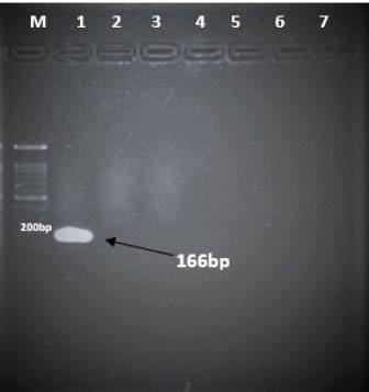 Specificity test for the qPCR primersConventional PCR was performed using FAdV-Hex_143F/R primers (Table 1) for amplification of 166 bp of the FAdV hexon gene. The DNA extracted from the UPM08136P20B1 live attenuated virus and the UPM11142CELP3EP2 challenge virus were used. The amplification conditions were 95°C for 2 minutes 1×, 95°C for 1 minute 35×, 50°C for 1 minute 35×, 72°C for 1 minute, 2 cycles 35× and 72°C for 1 minute 1×. The bands were separated in a 2% agarose gel electrophoresis using a 100 bp DNA ladder at 80 volts for 35 minutes. Standard curveFAdV positive control was used to generate the standard curve. An initial DNA concentration of 100 ng/µl was used and was diluted seven-fold from 100 to 0.0001 ng/µl. Optimization reactions were carried out to determine the best concentration for the primers and probe. The DNA copy number of the positive control was calculated using the formula below (Qiagen, 2014; Fajardo et al., 2017; Prediger, 2017). These dilutions were each amplified in triplicate in a total volume of 20 µl PCR reaction mix containing 10 µl of SensiFAST™ Probe No-ROX Kit (Bioline, London, UK), 0.8 µl of primer pair, 0.2 µl probe, 4.2 µl of nuclease-free water and 4 µl of the template. The non-template control was added in triplicate with nuclease-free water as a template. The qPCR amplification was carried out in CFX96™ Real-Time PCR Detection System (Bio-Rad, USA). The qPCR conditions were initial denaturation at 95°C for 2 minutes, 40 cycles of denaturation, and extension at 95°C for 5 seconds and 60°C for 20 seconds, respectively. qPCR amplification of extracted DNA of the liver and cloacal swab from chickensThe extracted DNA from the liver and cloacal swabs of chickens of each study group were checked for purity and concentration determined by using a spectrophotometer (UV-1601, PC, Shimadzu, Japan). Each pure DNA was used as a template for viral load determination by qPCR amplification with primer and probe as stated in Table 2. The qPCR reaction was carried out in triplicates in a total volume of 20 µl PCR reaction mix containing 10 µl of SensiFAST™ Probe No-ROX Kit (Bioline, London, UK), 0.8 µl of primer pair, 0.2 µl probe, 4.2 µl of nuclease-free water and 1 µl of the template. The non-template control was added in triplicate with nuclease-free water as a template. The qPCR amplification was carried out in CFX96™ Real-Time PCR Detection System (Bio-Rad, USA). The qPCR conditions were as described in the standard curve above. The Cq of each replicate was obtained and used to determine the copy number using a formula, and the average copy number of each sample recorded (Qiagen, 2014). Ethical approvalThis experiment was approved by the Universiti Putra Malaysia Institutional Animal Care and Use Committee and was conducted following international ethical standards. ResultsPrimers, probe, and specificityThe primers showed specificity to the UPM11142CELP5EP2 strain with a band corresponding to 166 bp and a negative band for the attenuated strain (Fig. 1). The primers and probe made use of mismatch positions in the conserved Li loop region of the hexon gene of FAdV 8b to differentiate between the two isolates (Fig. 2). Standard curveWith the aid of known FAdV 8b positive control, a standard curve amplification plot (Fig. 3) and standard curve (Fig. 4) were generated with an efficiency of 96.0%, Regression squared value of 0.997, slope value of 3.422, and y-intercept of 59.387. The plot shows the capacity of this assay to detect FAdV 8b from samples with DNA concentrations as low as 0.001 ng/µl. Detection and quantificationThere was positive FAdV 8b strain UPM11142CELP5EP2 in all the liver and cloacal samples of chickens that were inoculated and no detection among the C2 chickens that were uninoculated (Table 2). This indicates that the challenge virus replicated in the liver of the chickens and was shed in their feces. In the liver, at 7 dpi, the C1 chickens had significantly higher (p < 0.05) FAdV 8b copy number than chickens in A1 and B2 groups. At 14 dpi, the copy number of FAdV 8b in the C1 group was significantly higher (p < 0.05) than that of chickens in the A1, B1, and B2 groups and was higher (p > 0.05) that that of chickens in the A2 group. In the cloaca, at 7 dpi, the FAdV copy number of C1 chickens was significantly higher than that of chickens in the A1, A2, B1, and B2 groups, and at 14 dpi, the C1 group recorded significantly higher (p < 0.05) FAdV 8b copy number than that of A1 and B1, and higher (p > 0.05) than that of chickens in the A2 and B2 groups. Table 2. Copy number of FAdV UPM11142CELP5EP2 in the liver and cloaca of chickens at days 7 and 14 post-challenge.